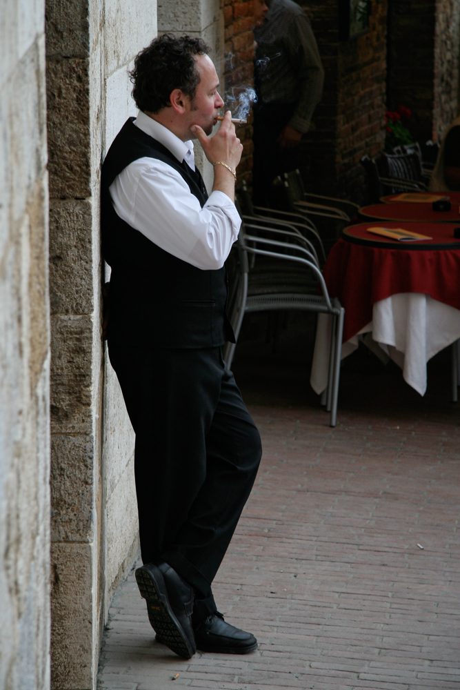 Und das ist die andere Seite: ein Kellner, es ist gerade nicht so viel los im Straßenlokal, stellt sich kurz auf die Seite, lehnt sich entspannt an die Hausmauer und steckt sich in aller Ruhe eine Zigarette an. Die Augen halb geschlossen, nimmt er friedlich und genießerisch einen ersten Zug und dann noch einen und irgendwann noch einen. Ohne Hektik, ohne Stress, einfach nur Pause und Genuss.
