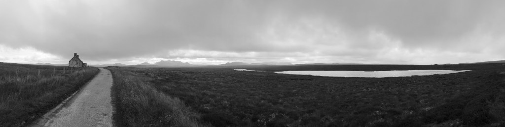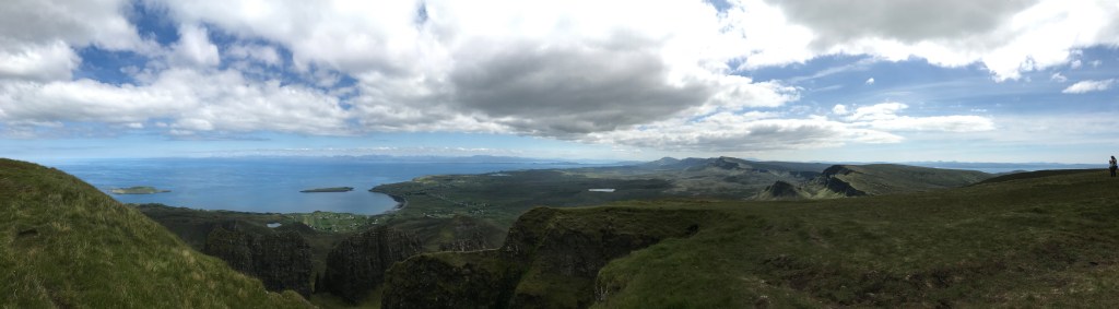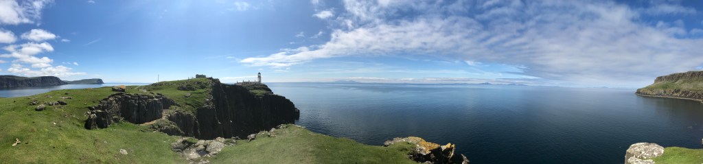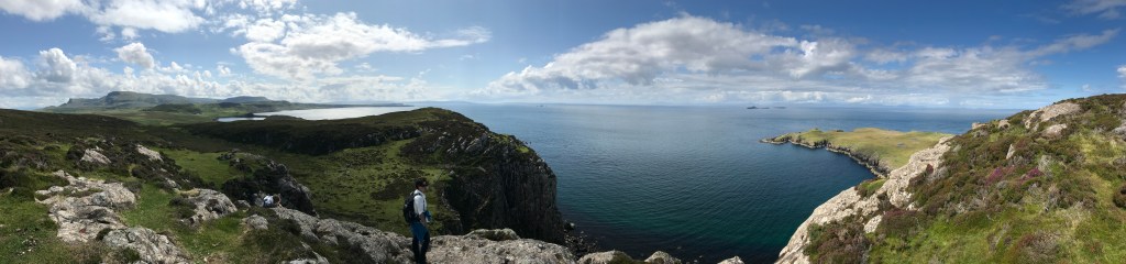 Gleichzeitig wird im Bild die Landschaft zur Miniatur. Die Weite wird überschaubar. So einen weiten Blick lassen unsere Augen in der Natur nicht zu. Das Panorama setzt alles ins Verhältnis. Der Blick fällt hier von Rhuba Hunnish auf den nördlichsten Zipfel der Isle of Skye. Kaum ein Tourist verläuft sich hier her.