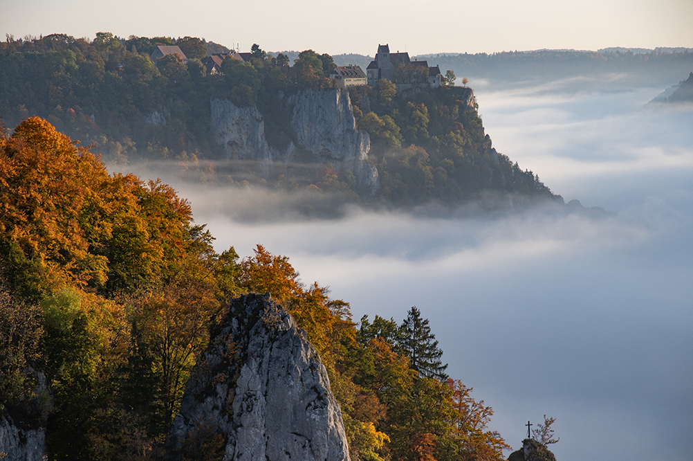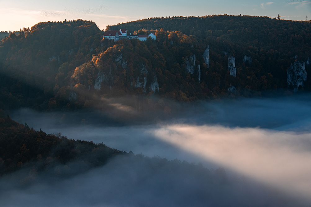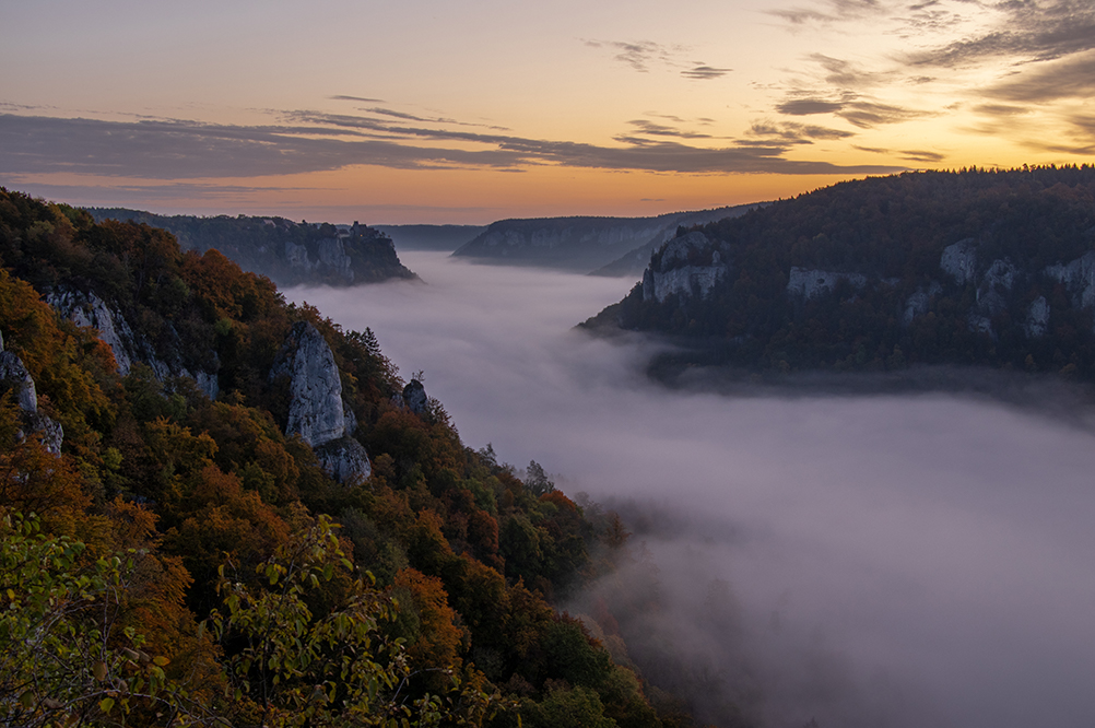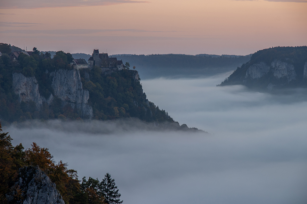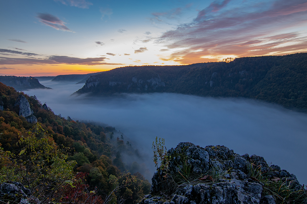 Hier in meiner Heimat Süddeutschland gibt es noch viele andere schöne und landschaftlich äußerst reizvolle Gegenden, die es zu besuchen lohnt. Auch dort hat man gute Chancen, den mystischen Nebel auf Foto zu verewigen. Eine dieser Gegenden ist die Schwäbische Alb. Hier war ich letztes Jahr am Eichfelsen. Dieser liegt oberhalb des Oberen Donautals und bietet bei fast jedem Wetter eine wahnsinns Aussicht. Ich war dort eine gute Stunde vor Sonnenaufgang und konnte schon mal die Stimmung genießen. Der Tag begann zu dämmern und im Tal bildeten sich einzelne Nebelschwaden. Das sah so schon mal nicht schlecht aus, doch was sich mir später bot war fantastisch. Kurz vor Sonnenaufgang bildete sich im Tal ein Nebelfluss. Ich hatte so etwas noch nie gesehen und war dementsprechend von den Socken. Mir fiel sofort der mystische Fluss Styx ein, der in der griechischen Mythologie seine Wurzeln hat, so, genau so stellte ich ihn mir vor. Jetzt fehlte nur noch Charon der Fährmann mit seiner Barke. Also das war genau mein Ding.