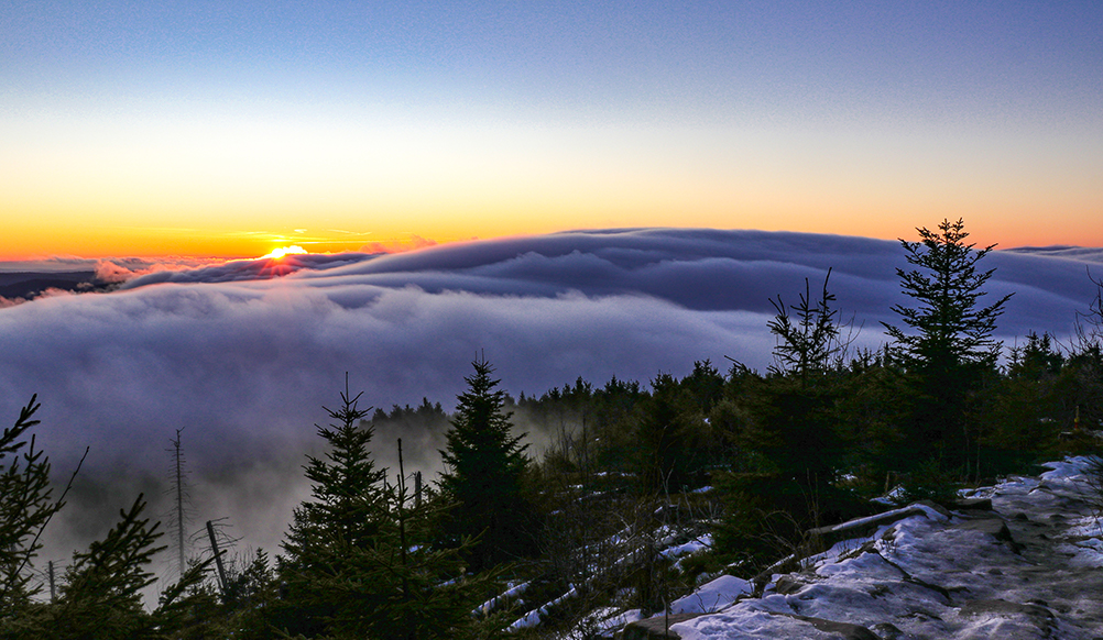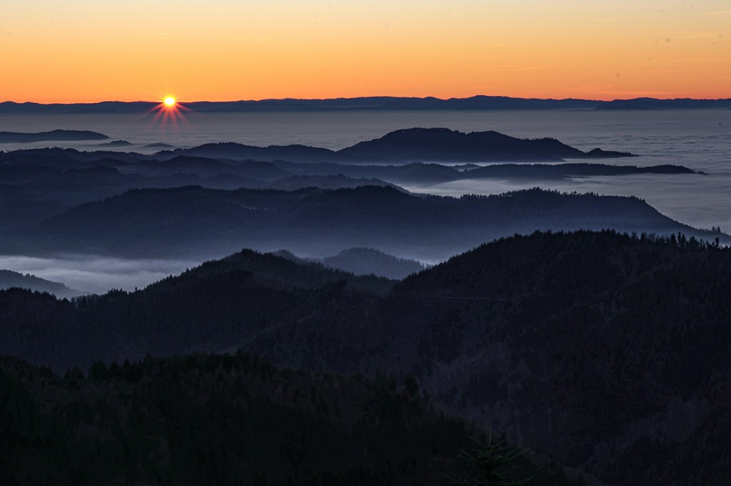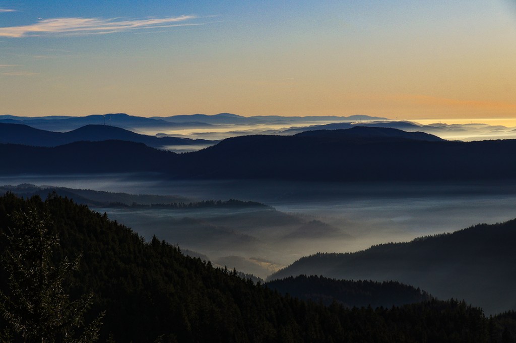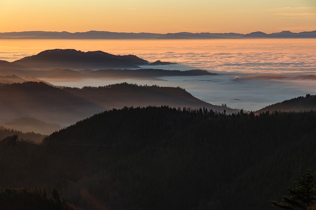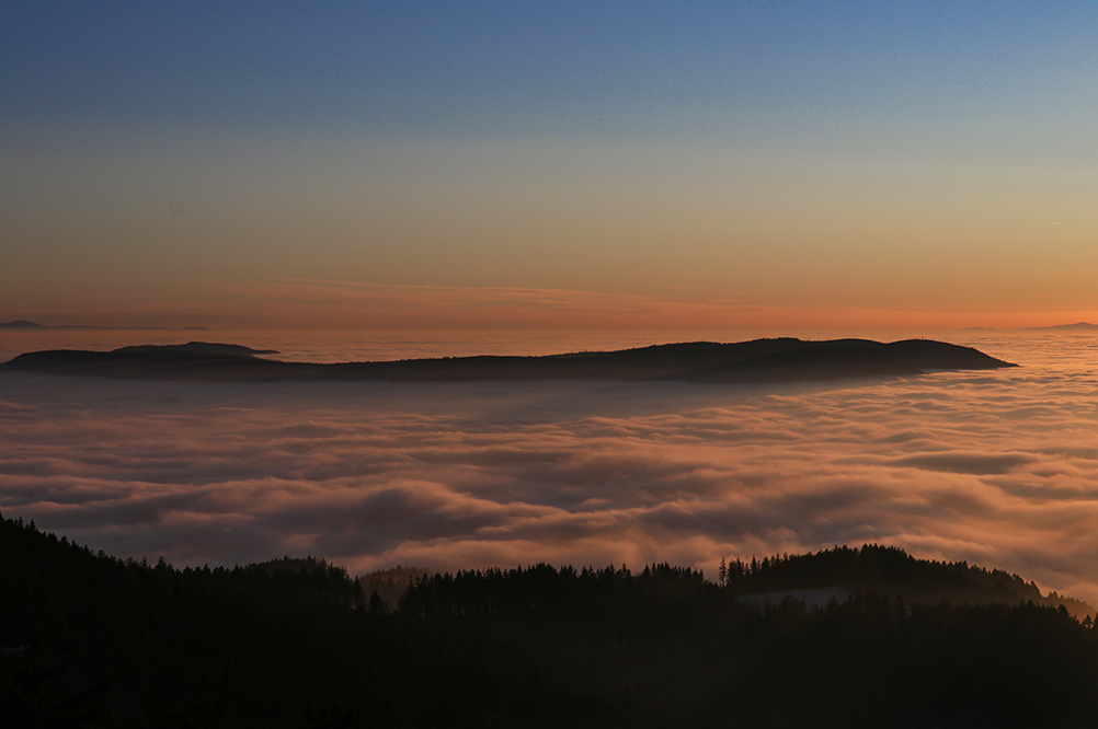 Ein anderes Wetterphänomen ist die Inversion, einfach ausgedrückt heisst das, im Tal sind die Luftmassen kälter als auf den Höhen. Dadurch sammelt sich unten der Nebel und über ihm scheint die Sonne. Dann, wenn also im Schwarzwald mal wieder Inversionswetterlage herrscht, kann ich mich kaum beherrschen und in meinem Auslösefinger juckt es verdächtig. Ich fahre also auf die Schwarzwaldhochstrasse im nördlichen Schwarzwald und ziehe mit der Kamera los. Wenn man zum Beispiel auf dem Schliffkopf, oder auf der Hornisgrinde, seinen Blick in Richtung Frankreich zu den Vogesen schweifen lässt, zeigt sich einem oft ein überwältigendes Bild. Das Rheintal liegt mit Nebel bedeckt vor einem und die Hügel des Schwarzwaldes schauen aus dem Dunst. Mal ganz wenig, nur die Gipfel, mal etwas mehr, dem Nebel eine Form gebend. Am Horizont zeigen sich die Vogesen und runden das Bild ab. Wenn nun die untergehende Sonne ihr Licht auf das Nebelmeer wirft, ist dieser Anblick einzigartig. Ich liebe es.
