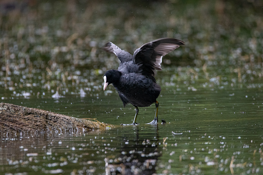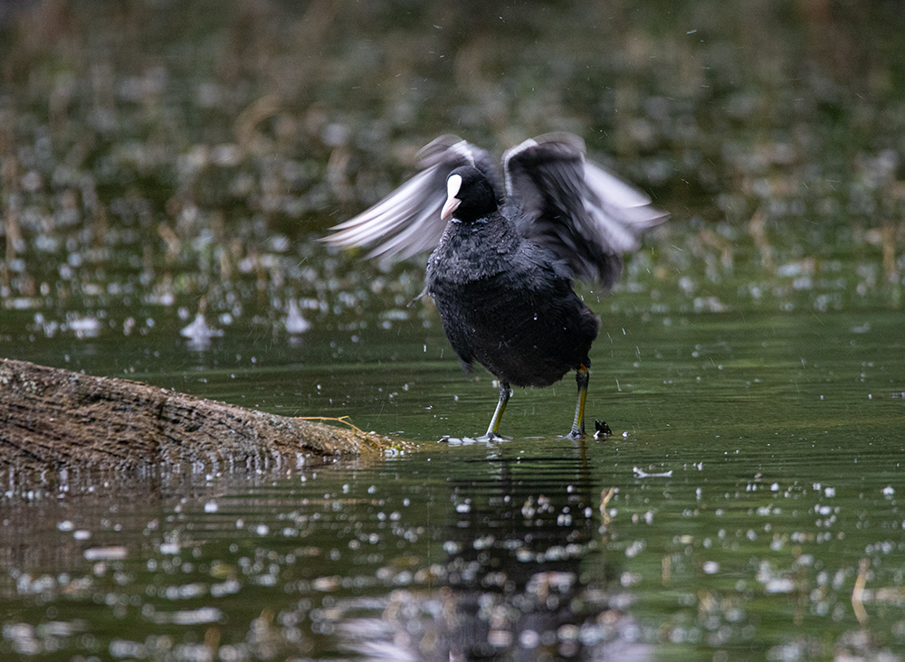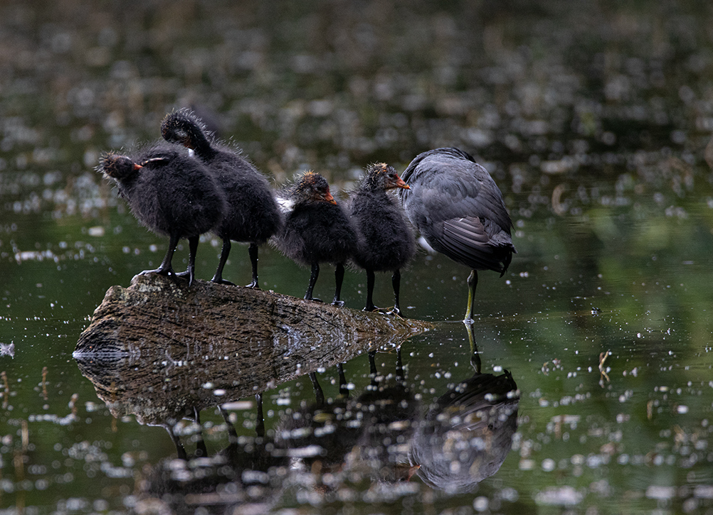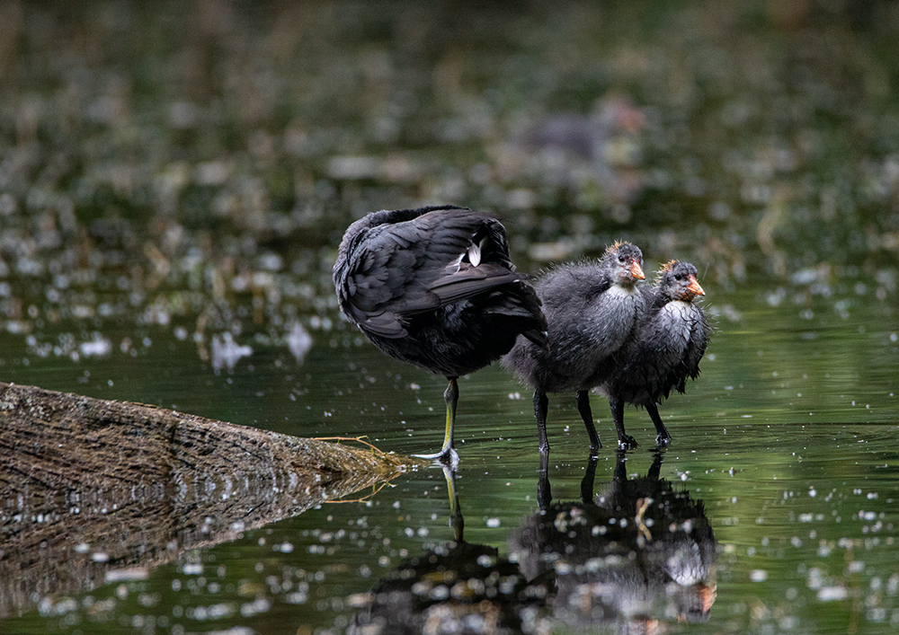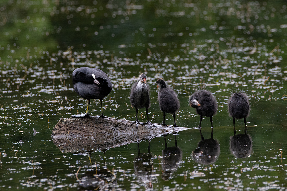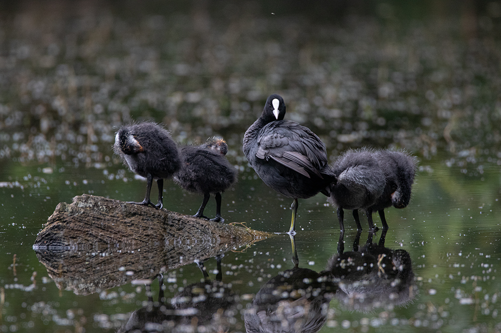 Während ich am Teich saß und seine Bewohner beobachtete, freute ich mich daran, wie viel Leben an diesem kleinen Gewässer herrscht. Die Küken der Blässhühner hatten einen riesen Wachstumsschub hingelegt und waren putzmunter. Der Fuchs hat bisher keins davon erwischen können, denn sie waren alle vollzählig. Welche Freude. Die Blässhuhnfamilie machte uns den Gefallen und brachte sich in Position, um uns zu zeigen wie emsig sie bei der Gefiederpflege ist. Einfach toll anzuschauen.