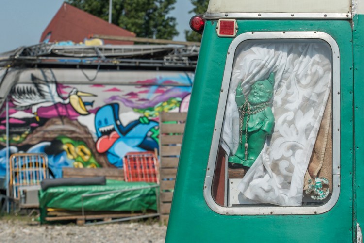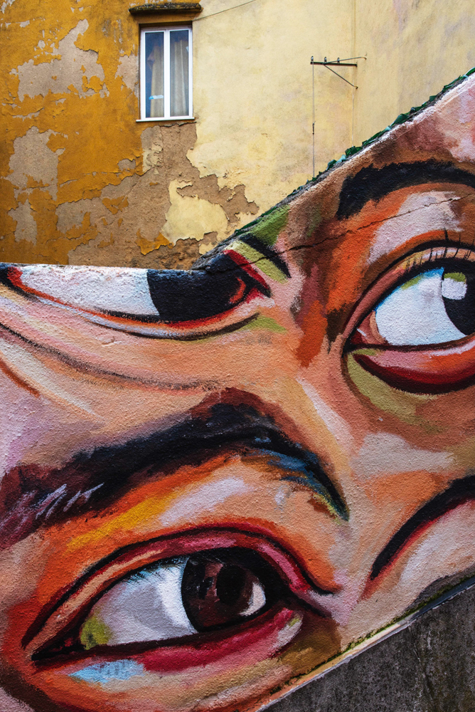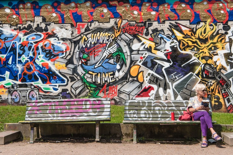 Durch das Einbeziehen der Umgebung entsteht plötzlich ein ganz anderes Bild, und die Aussage des Fotos verändert sich. Aus der reinen Dokumentation eines Graffitis wird ein Bild, in der das bunte Gemälde nur noch den attraktiven Rahmen gibt.
