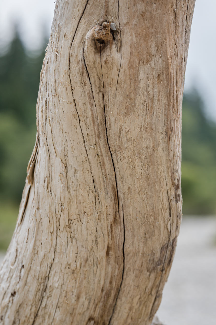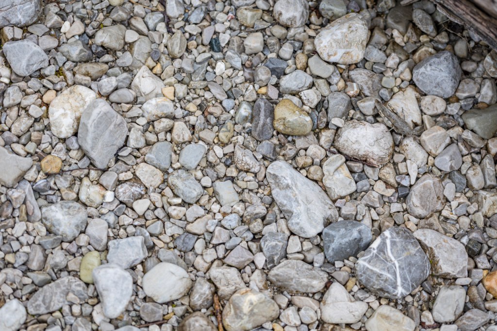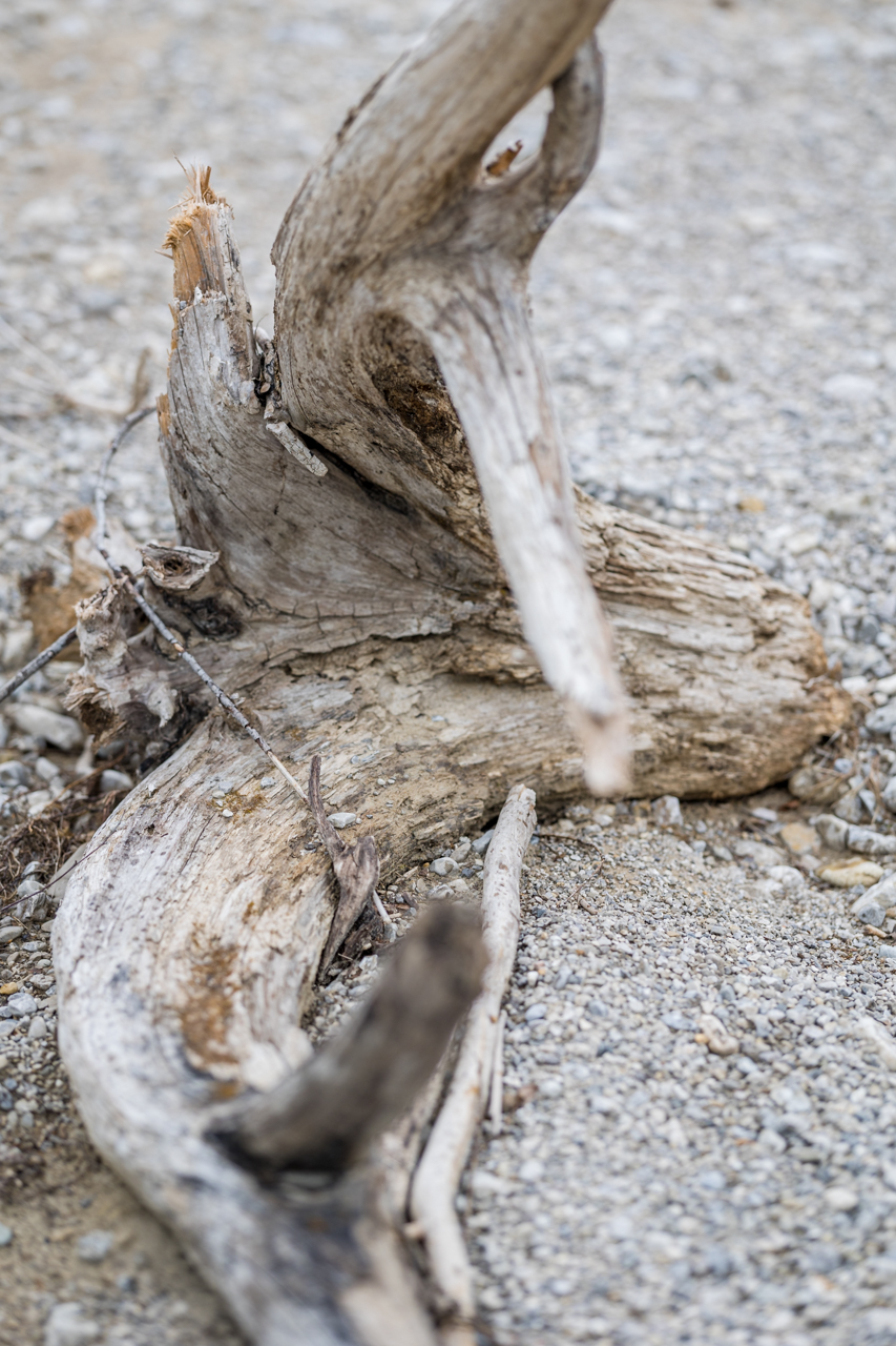 Fragt sich bloß: wo ist eigentlich der Fluss? Der ist um diese Jahreszeit ein klitzekleines Bächlein (nicht fotografiert). Auf Fachchinesisch wird diese Art von Landschaftsform als „Wildbach-Umlagerungsstrecke“ und lokal als „Gries“ bezeichnet (mehr Infos dazu auf den Seiten des Naturparks Ammergauer Alpen). Dementsprechend war ich also im Lindergries unterwegs, und da gibt es wirklich allerlei zu sehen. Denn der Fluss (wenn er denn mal Wasser führt, insbesondere zur Schneeschmelze im Frühjahr) transportiert natürlich allerlei Krempel talabwärts, von kleinen Dingen bis hin zu weniger kleinen.