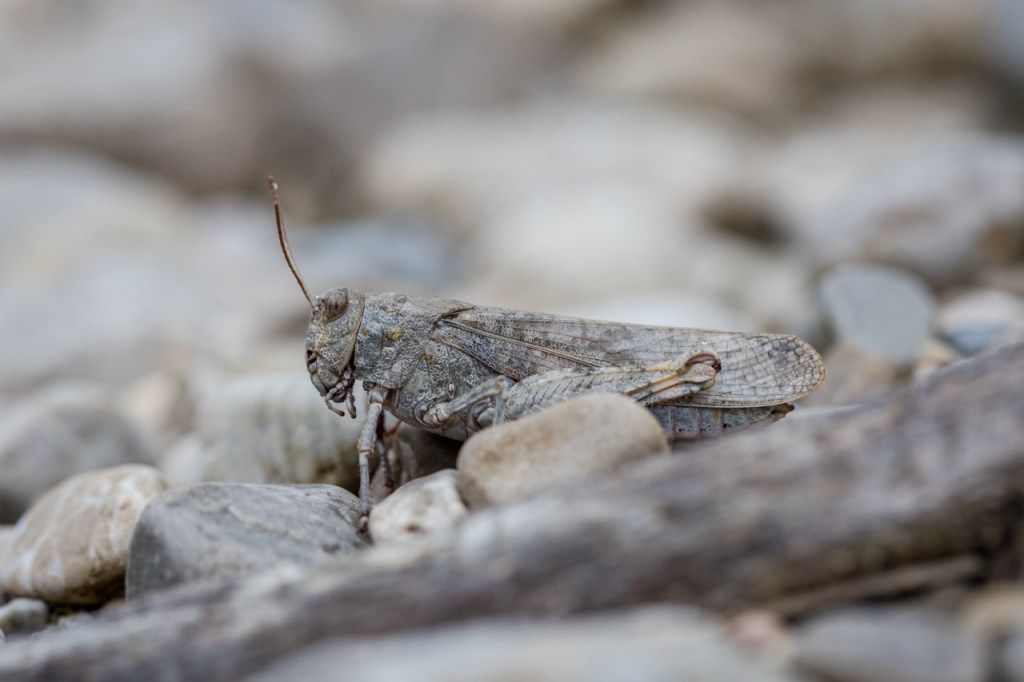 Es ist nämlich nicht irgendein Nullachtfünfzehn-Hüpfer, sondern die extrem seltene Gefleckte Schnarrschrecke (Bryodemella tuberculata, mehr Info hier), die im Alpenraum und überhaupt in Europa nur noch an ganz wenigen Stellen vorkommt. Ihr Lebensraum sind genau diese unverbauten, wilden Flusstäler mit ihren ausgedehnten Schotterfluren. Tja, und die hat der Mensch nun mal zum allergrößten Teil zerstört. Somit sind auch die allermeisten Vorkommen dieser hochspezialisierten Insektenart unwiederbringlich verloren.