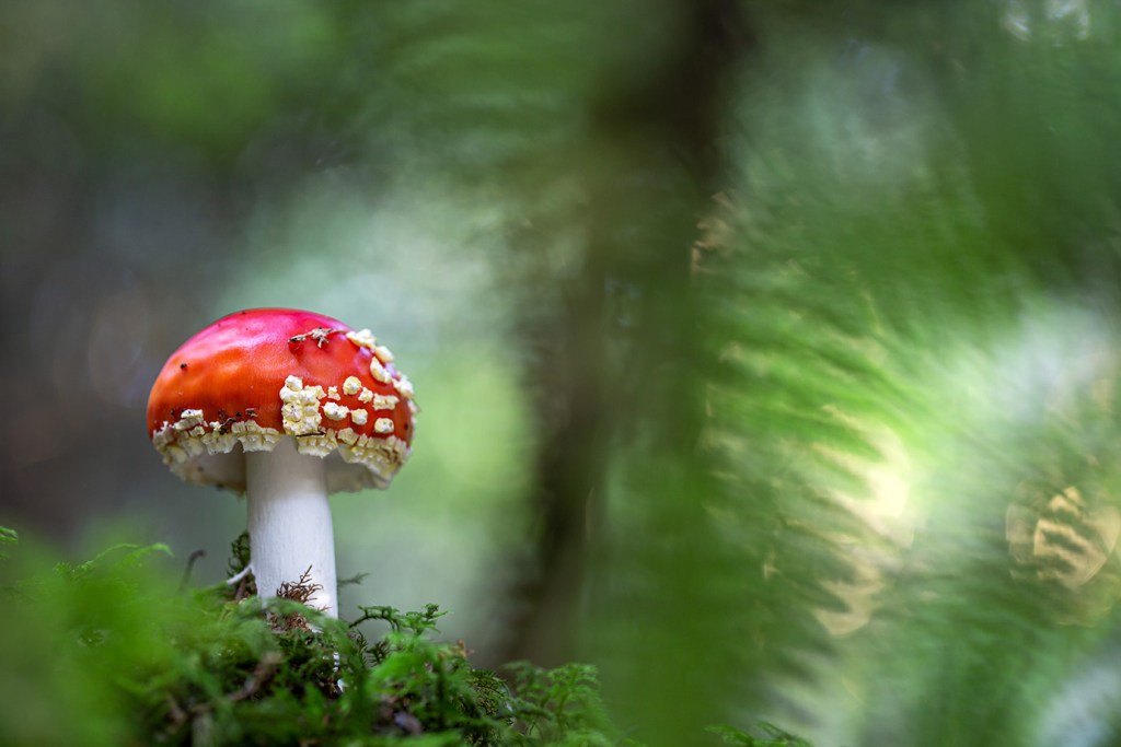 Natürlich darf es auch mal ein grösserer Pilz sein, vor allem wenn er so fotogen daherkommt wie der Fliegenpilz! Sie wachsen gerne unter Tannen in moosigem Boden, oft auch in Gesellschaft von Steinpilzen. Ich kenne einen wunderbaren Platz mit Moos, Tannen, ein paar Baumstümpfen und vielen Fliegenpilzen (leider nicht jedes Jahr). Wenn ich am späten Nachmittag auf dem moosigen Boden liege, die Sonne sehr tief in den Wald hineinscheint und die letzten, warmen Strahlen über die Pilze und die Baumstämme wandern, fühle ich mich fast wie in einem Märchen. Es fehlt nur noch das Rotkäppchen, das mit seinem Körbchen über das Moos durch den Wald zu seiner Grossmutter hüpft!