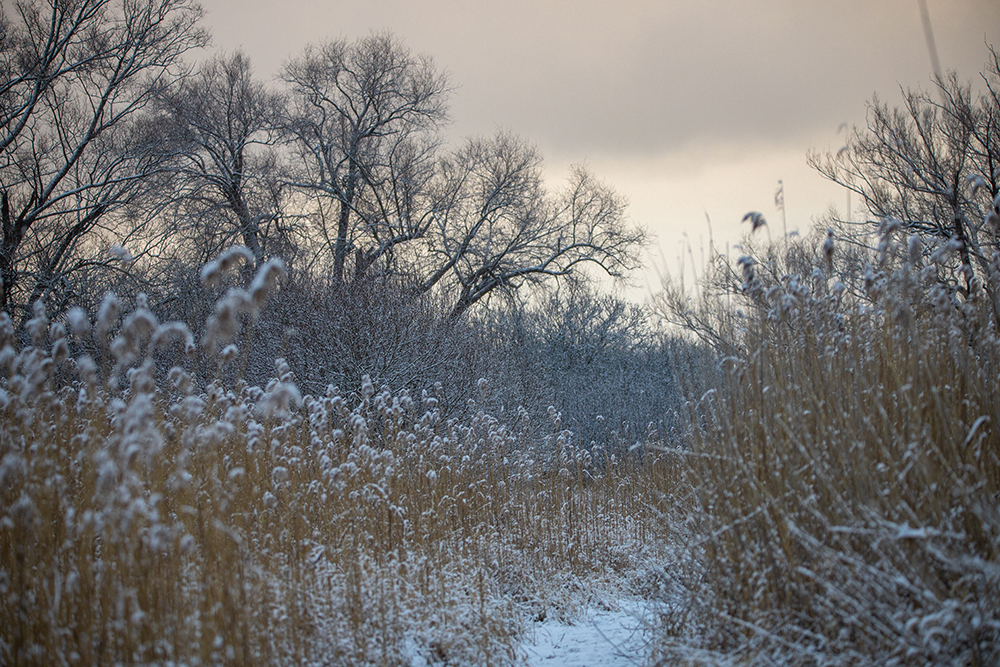 Die Wanderung durch den verschneiten Schilfgürtel war dennoch ein Erlebnis, vor allem wenn man sonst fast ausschließlich im Wald umherstreift und „nur“ Nadelbäume um sich hat. Kurz zeigte sich schemenhaft die Sonne hinter den blassen Wolken und tauchte das Schilf in ein diffuses Licht. Das war schon eine sehr tolle Stimmung, die wir genießen konnten. Allerdings war das Sonnenintermezzo nur von kurzer Dauer, denn für den Rest des Tages sollte es trüb und duster bleiben.