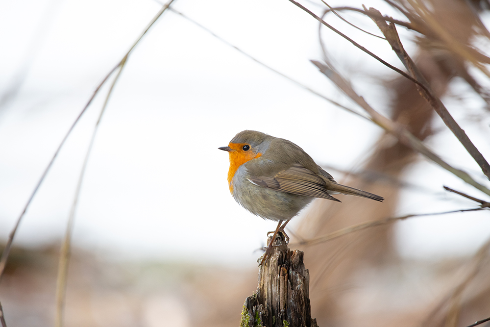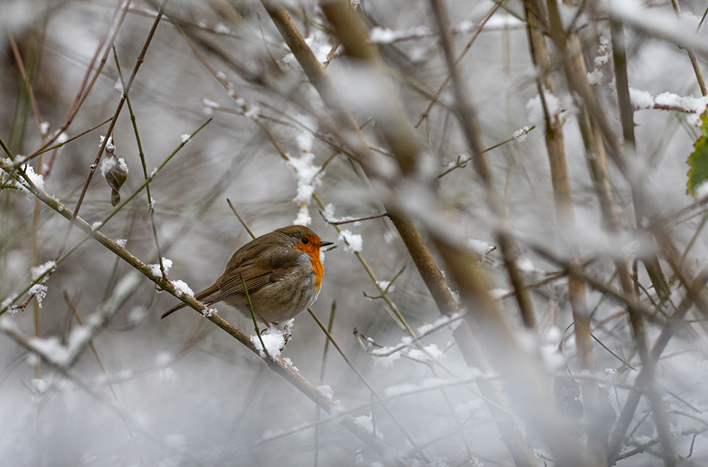Für mich hat das Ried zu jeder Jahreszeit einen besonderen Reiz. Jetzt im Winter, wenn man sich die Zeit nimmt in die weiße Stille einzutauchen und zu beobachten, findet man immer etwas Sehenswertes. Sagt zumindest das freche Rotkehlchen.