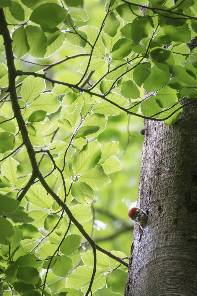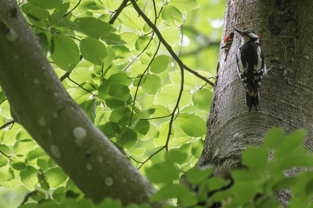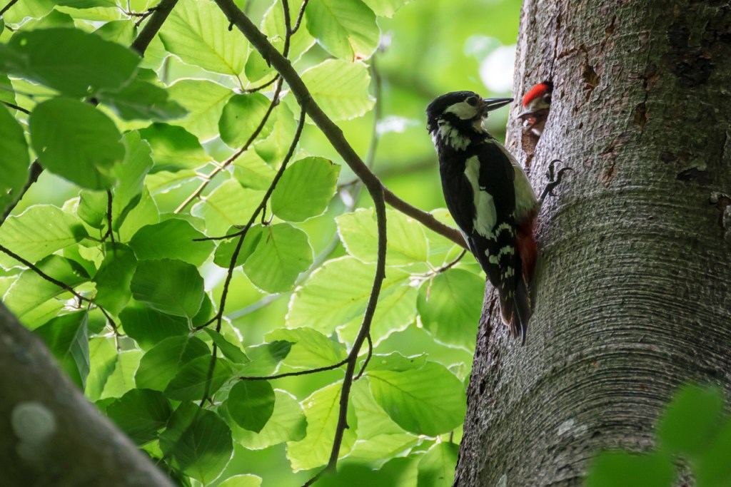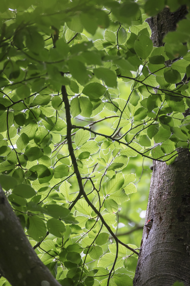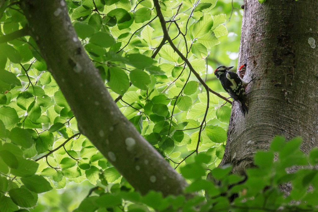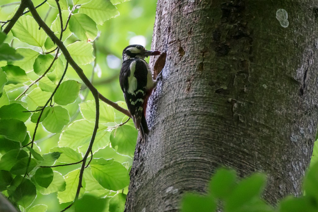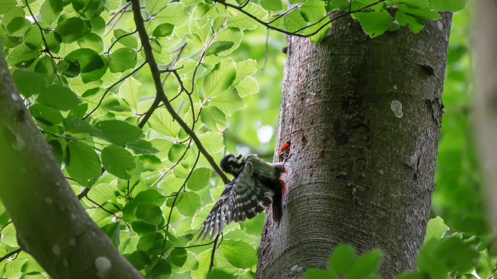 So ein glatter Buchenstamm ist vermutlich eine unüberwindbare Hürde für Marder und andere potenzielle Nesträuber – erst recht, wenn die Höhle in vielleicht 15 Metern Höhe gezimmert wurde. Eine schöne Aussicht hat man von dort! Wobei dieser junge Buntspecht (erkennbar an seiner noch ganz roten Kopfplatte) vermutlich weniger an dieser interessiert war als vielmehr an Mampf.