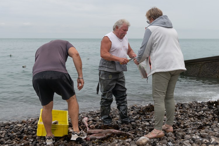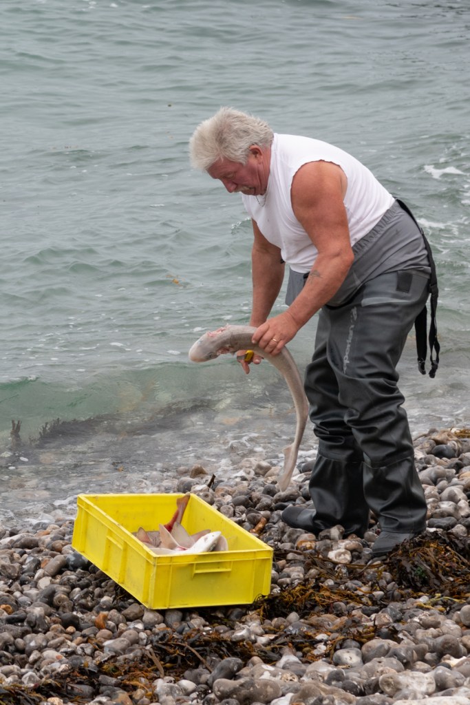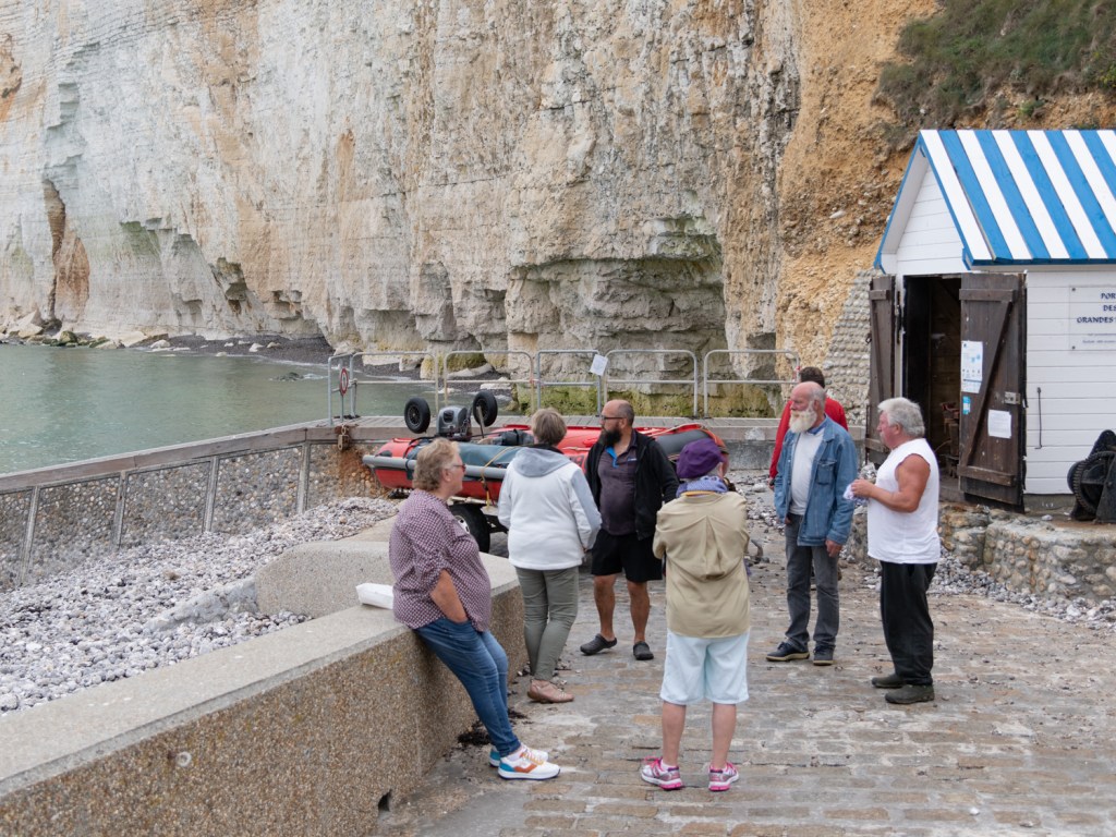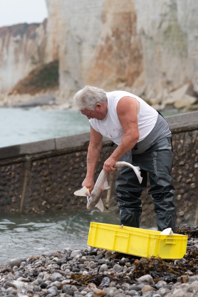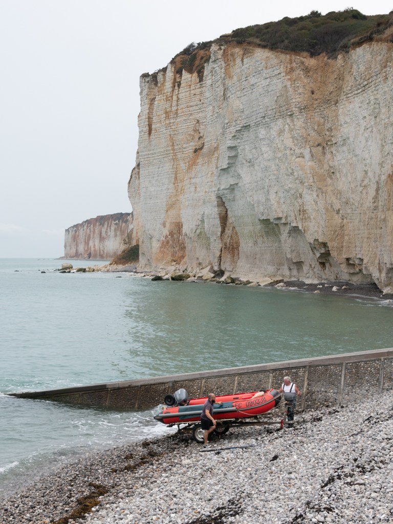 Das ist hier, an der Alabasterküste der Normandie, nichts Ungewöhnliches. Aber da es ja sonst nicht viel zu gucken gibt, beobachte ich die beiden weiter. Während der eine das Boot sichert, läuft der andere mit einer gelben Kiste zurück ans Wasser und fängt an, Fische auszunehmen.