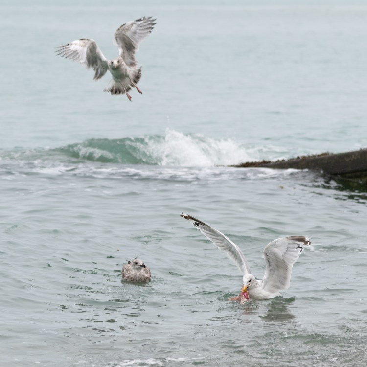 Das mit der Ruhe ist nun auch vorbei, denn die Möwen haben „den Braten gerochen“ und stürzen sich mit Geschrei auf die ins Meer zurück geworfenen Innereien.