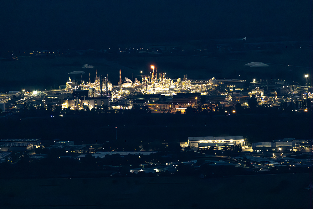 Als es immer dunkler wurde, boten sich auch noch andere Motive, wie diese Fabrik in Frankreich. Das Gelände leuchtete wie ein Weihnachtsbaum.