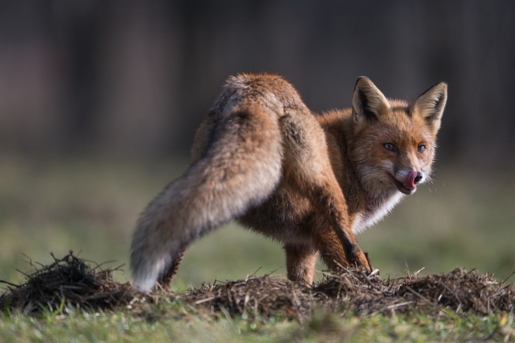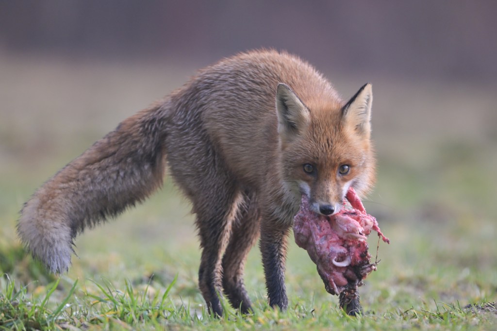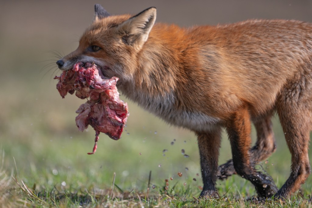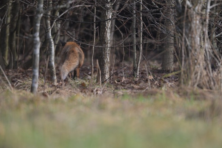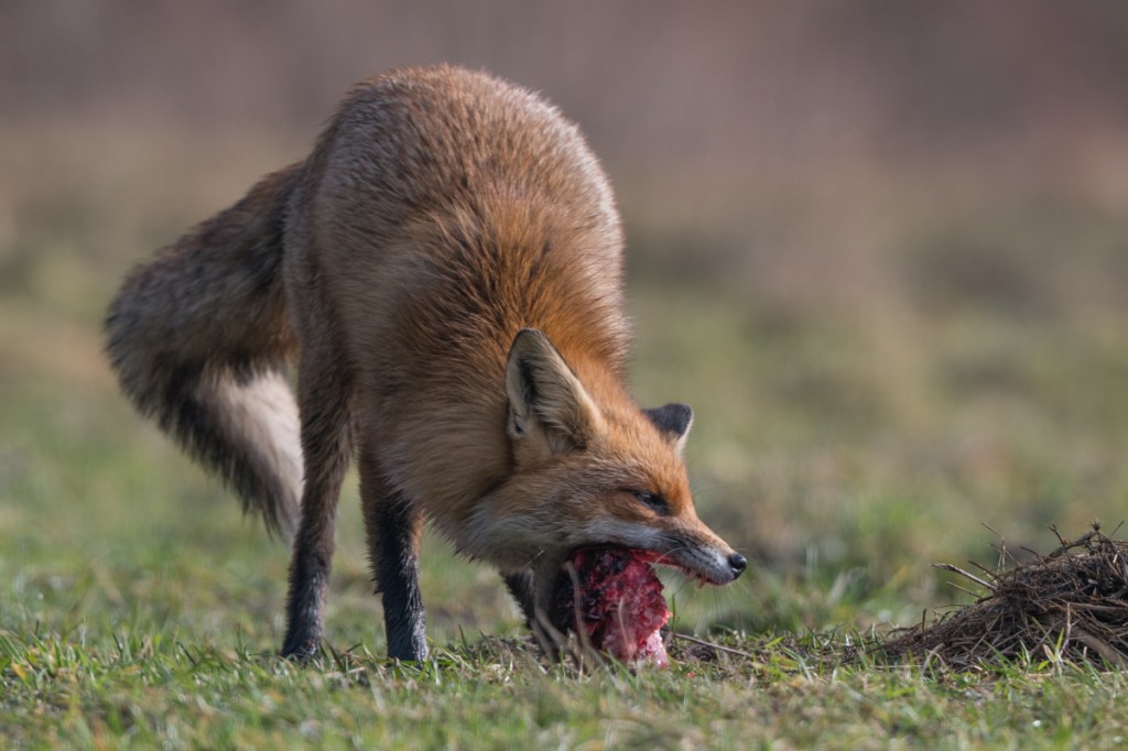 Dass der Fuchs uns fast drei Stunden lang immer wieder besuchte, im Wald verschwand und wieder auftauchte, hatte natürlich einen Grund. Die wenigsten Wildtierfotos entstehen zufällig und ungeplant. Oft werden die Tiere durch Futter angelockt, was hier sowohl bei den Vögeln (Streufutter) als auch beim Fuchs (angefahrener Waschbär und Innereien eines Schweins) der Fall war.