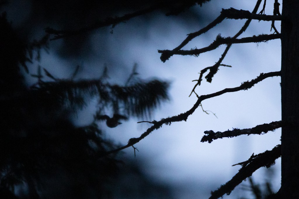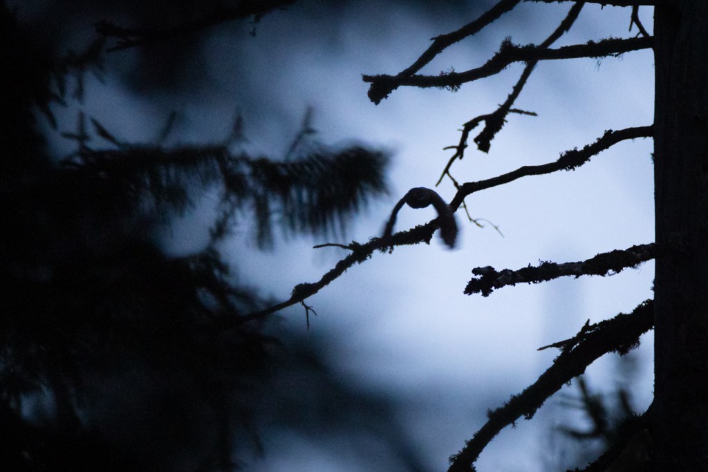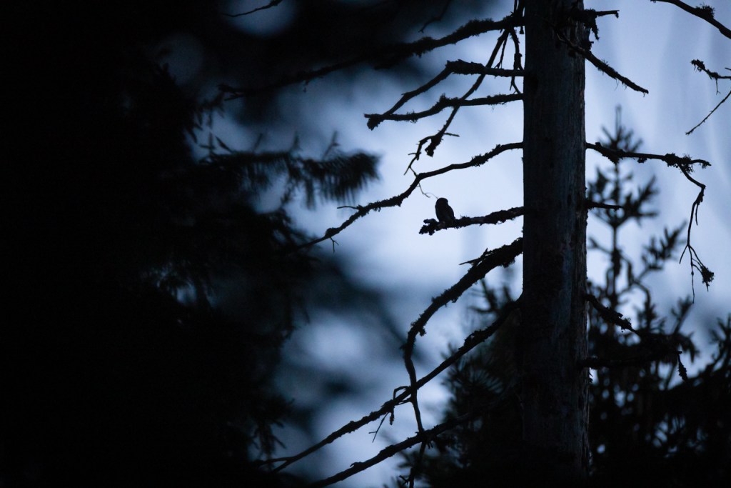 Ich will schon fast aufbrechen und mich auf den Rückweg machen, da nehme ich plötzlich abermals optisch eine Bewegung wahr, eben noch sichtbar oberhalb der schwarzen Baumsilhouetten. Ein Schatten landet auf dem Ast eines toten Baumes und bleibt sitzen, kurz darauf quietscht es wieder. Das Weibchen ist gelandet!