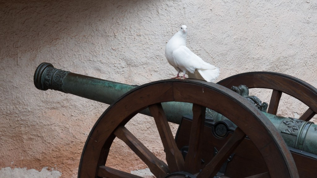 Dieses Bild der Taube auf der Kanone lässt in der aktuellen Zeit reichlich Spielraum für Interpretationen. Ich will mich gar nicht erst darin versteigen und halte es also einfach – passend zum kürzlich zu Ende gegangenen European Song Contest in Basel – mit Nicole: „Ein bisschen Frieden,… einen bisschen Freude… das wünsch ich mir!“