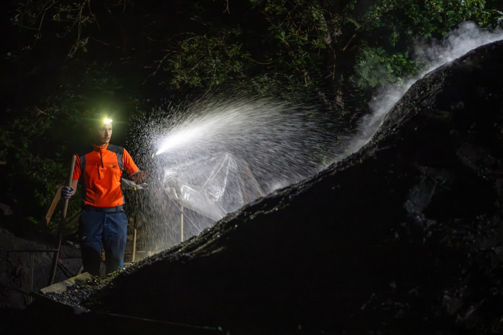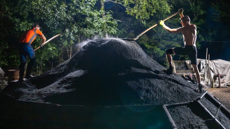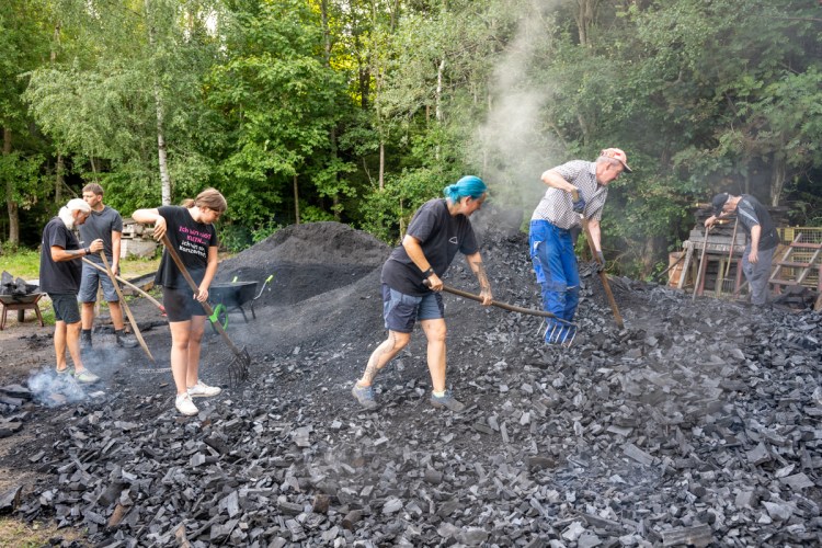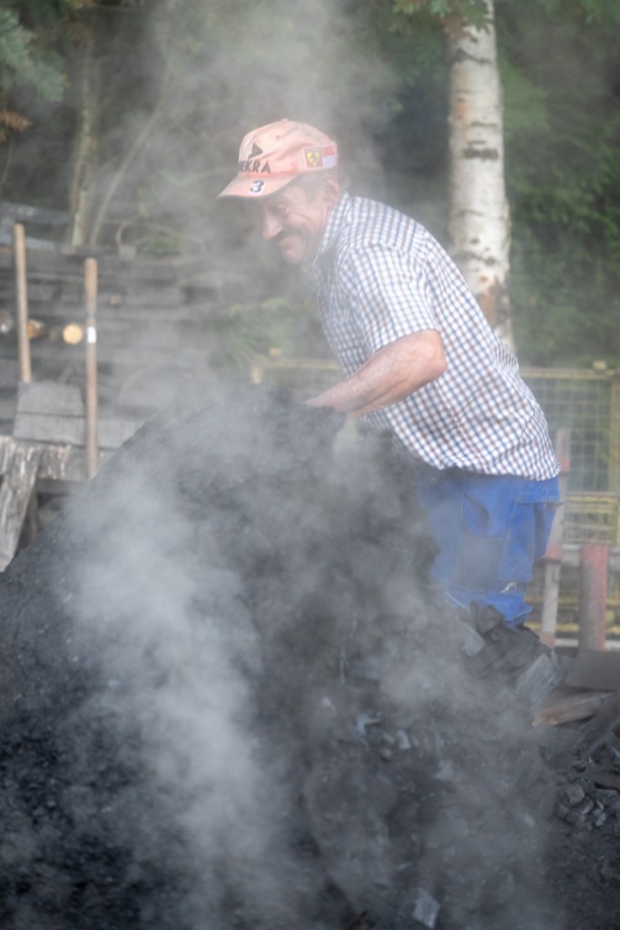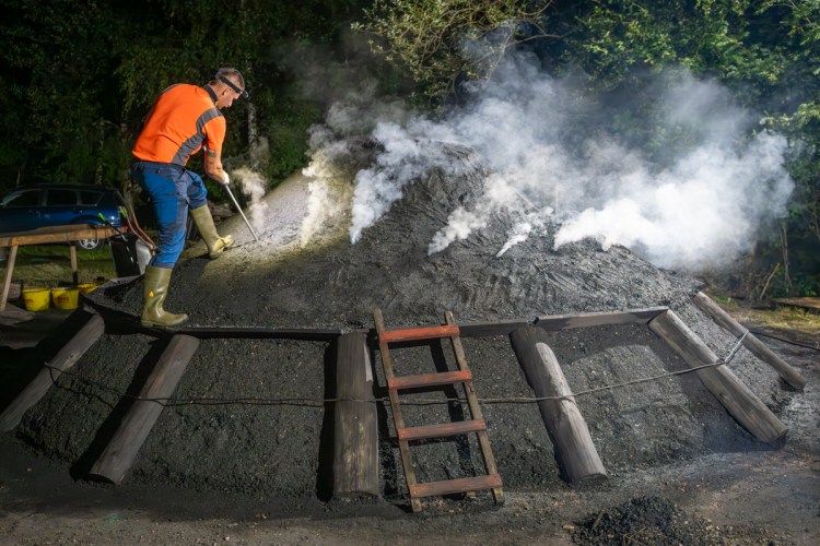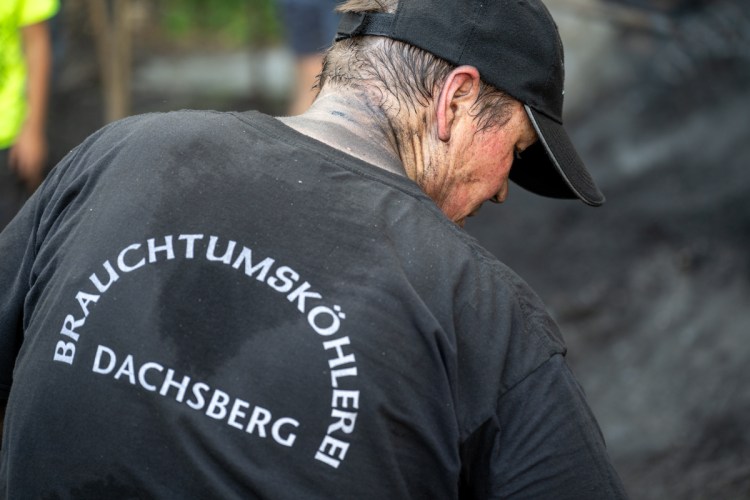 Das Holz darf nicht brennen, sondern nur kokeln. Der Meiler muss rund um die Uhr beobachtet und alle zwei Stunden von oben her verdichtet werden – eine anstrengende und mühsame Arbeit für Körper und Lunge. Wenn man sich zudem vor Augen hält, dass einige Leute extra Urlaub nehmen, um die Tages- und Nachschichten abzudecken, dann wird deutlich, mit welcher Ernsthaftigkeit man hier bei der Sache ist.