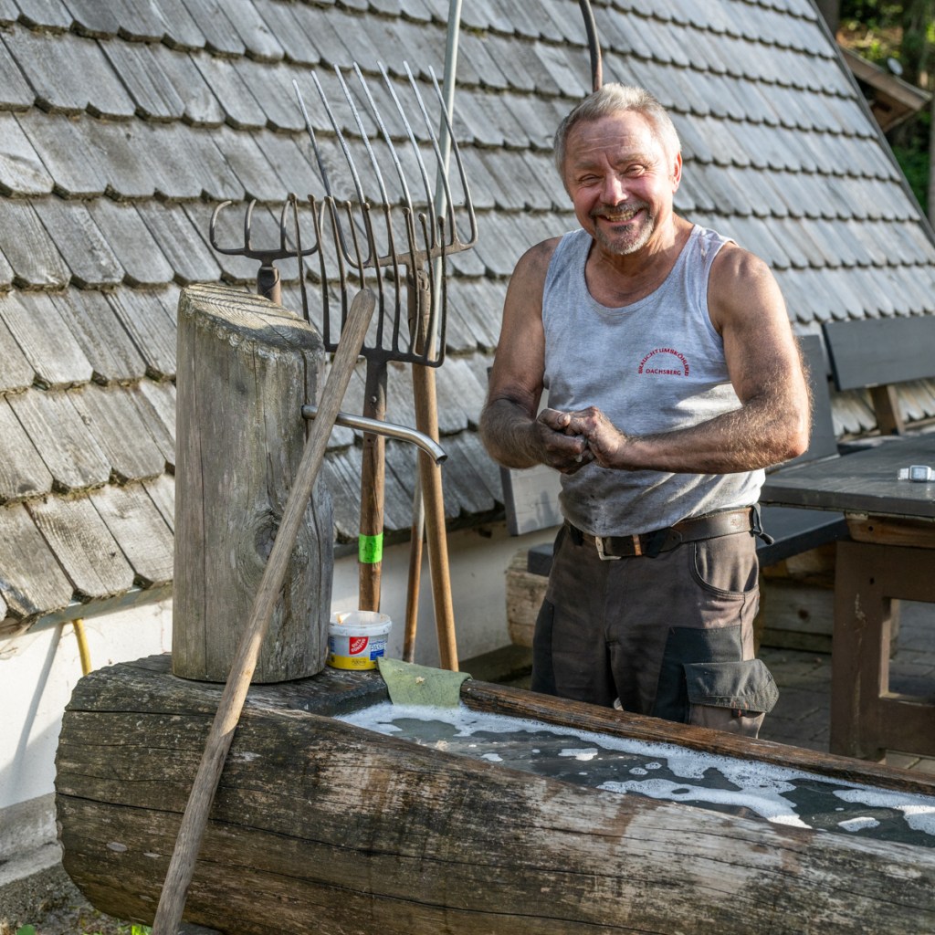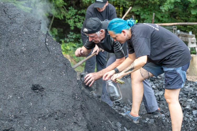 Aber mit der Holzkohle kann man nicht nur Grillen, sondern auch allerlei Beschwerden lindern. Sie bindet Bakterien und Giftstoffe und wird gerne zur Behandlung von Durchfall eingesetzt. Und so werden aus dem tiefsten Punkt des Meilers ein paar Gläser für die Hausapotheke gefüllt.