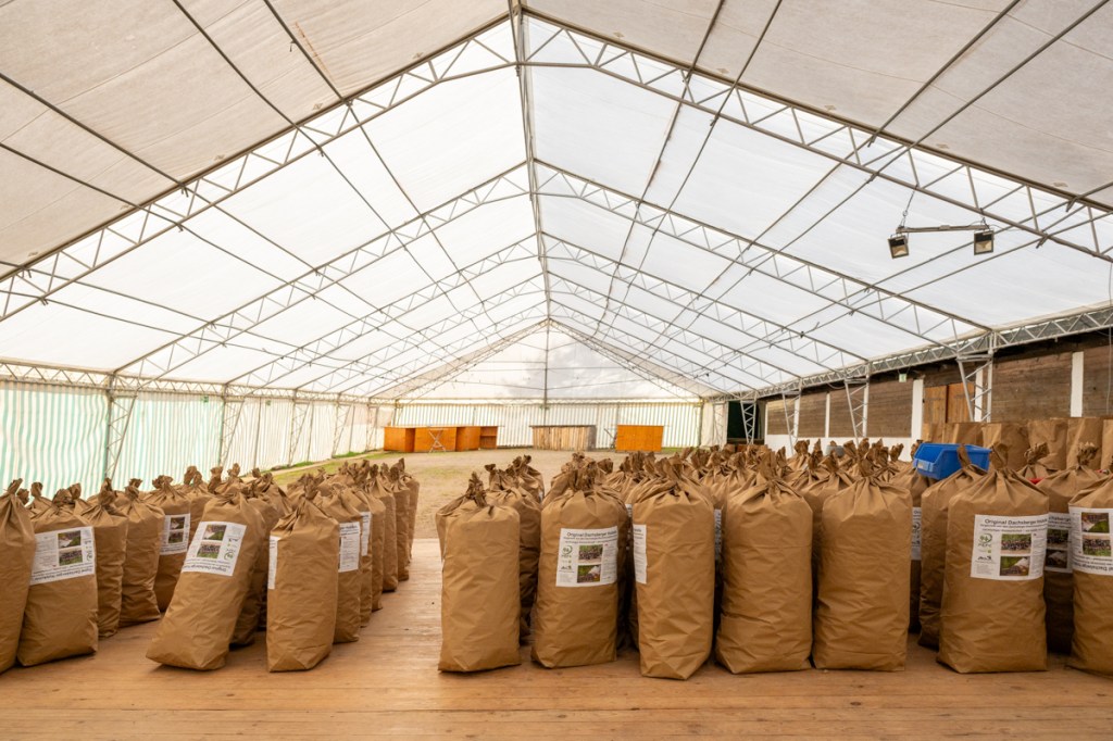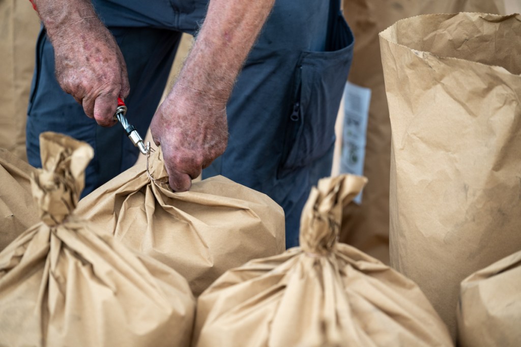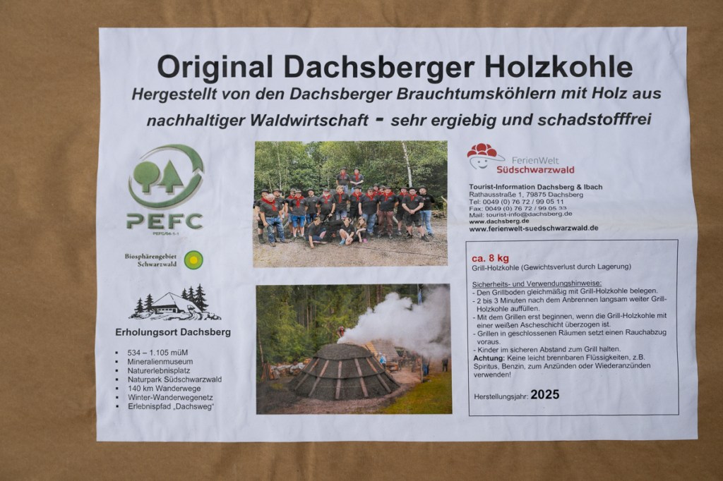 Die 8 kg und 5 kg schweren Säcke mit Grillkohle sind abgepackt und stehen im benachbarten Festzelt zur Abholung bereit. Diese können nun bei der Gemeinde Dachsberg käuflich erworben werden. Die Gemeinde hat das Holz für den Meiler zur Verfügung gestellt und erhält es nun in Form von Grillkohle wieder zurück.