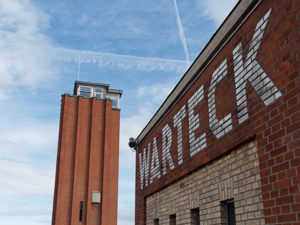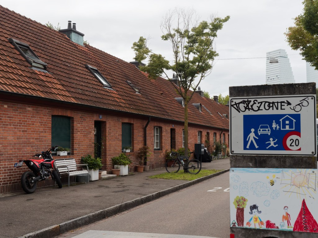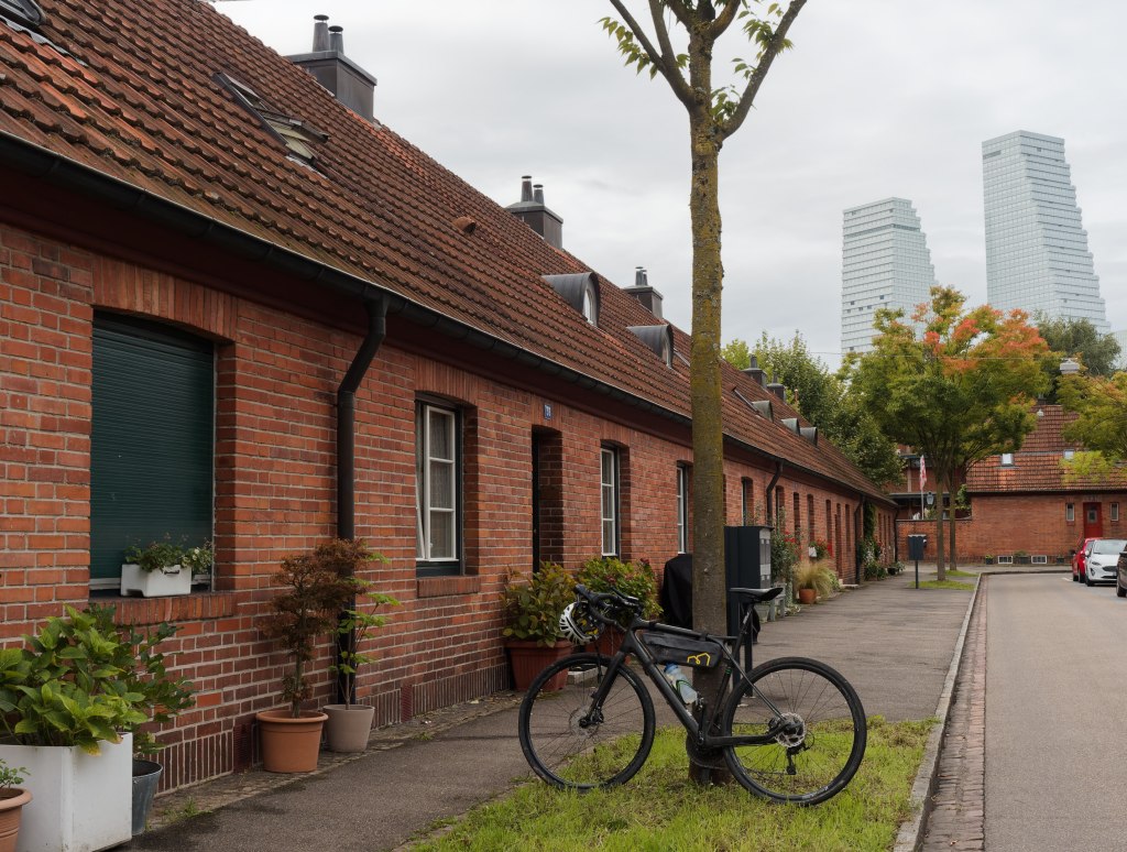 Im Anschluss kann man es bergab rollen lassen. Bevor es über den Rhein geht, schaue ich noch in der Paracelsusstraße vorbei. Dort liegt eine kleine Backsteinhaussiedlung – man fühlt sich eher nach Norddeutschland versetzt. Wären da nicht schon wieder die Roche-Türme im Hintergrund…