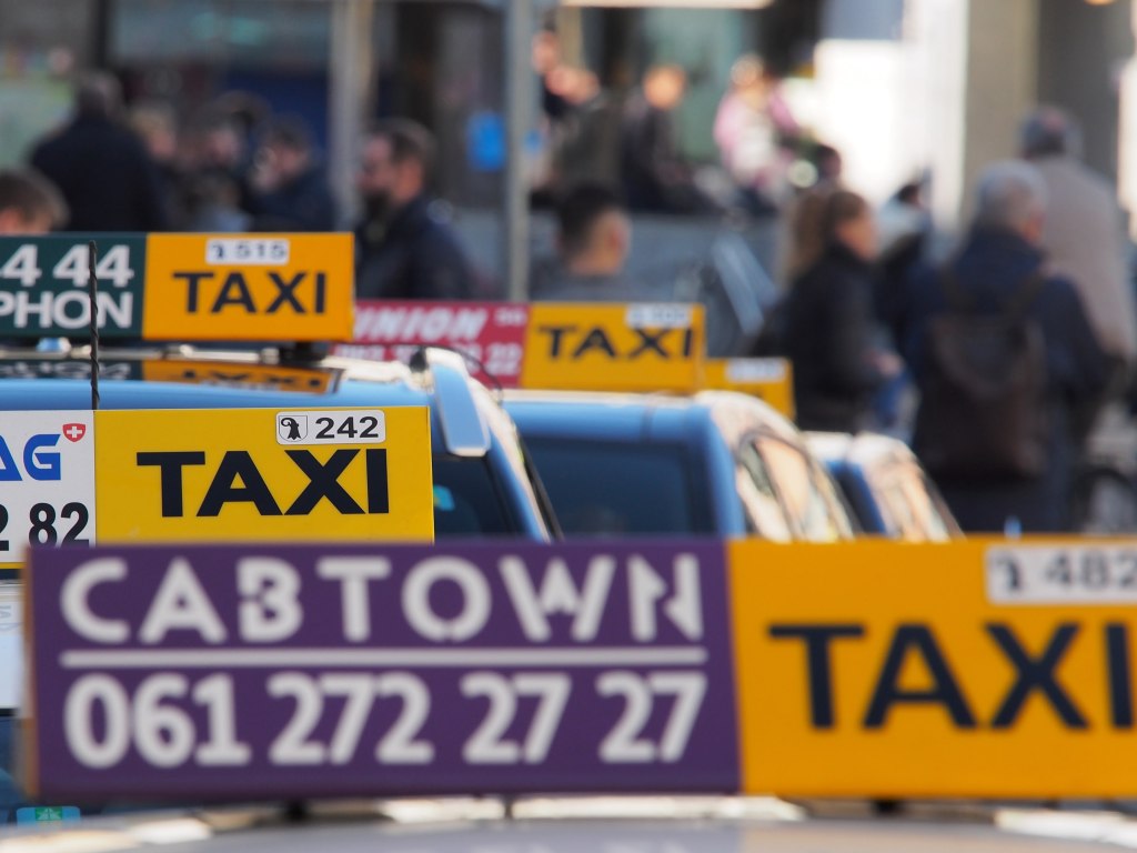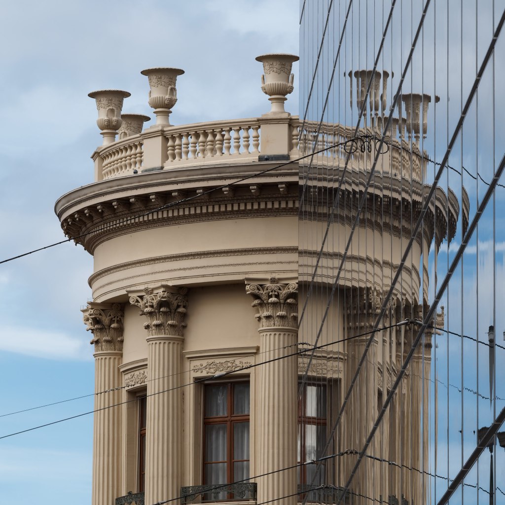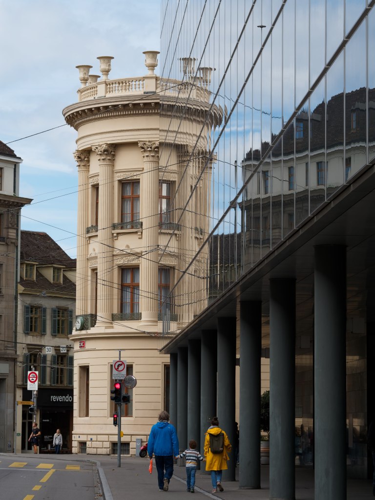 Vorbei am Kunstmuseum geht es Richtung Bankenviertel, wo es betriebsam zugeht. Die Fußgänger eilen über die Straße. Durch die Spiegelung wirkt das Gebäude der CIC Bank eher wie ein in Scheiben geschnittener Rundturm. Die Taxis warten vor dem SBB auf Kunden.