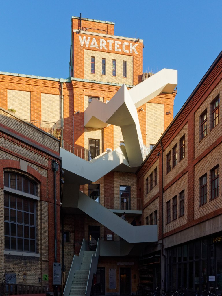 Wenige Minuten später bin ich bereits am nächsten Fotostop angelangt. Das Warteck, ein ehemaliges Brauereigebäude, ist mittlerweile Heim für verschiedene Kultureinrichtungen und Gastbetriebe. Vor allem fällt die eigenwillige Außentreppe auf. Diese kann man auch hinaufsteigen und hat wiedermal einen schönen Rundumblick.