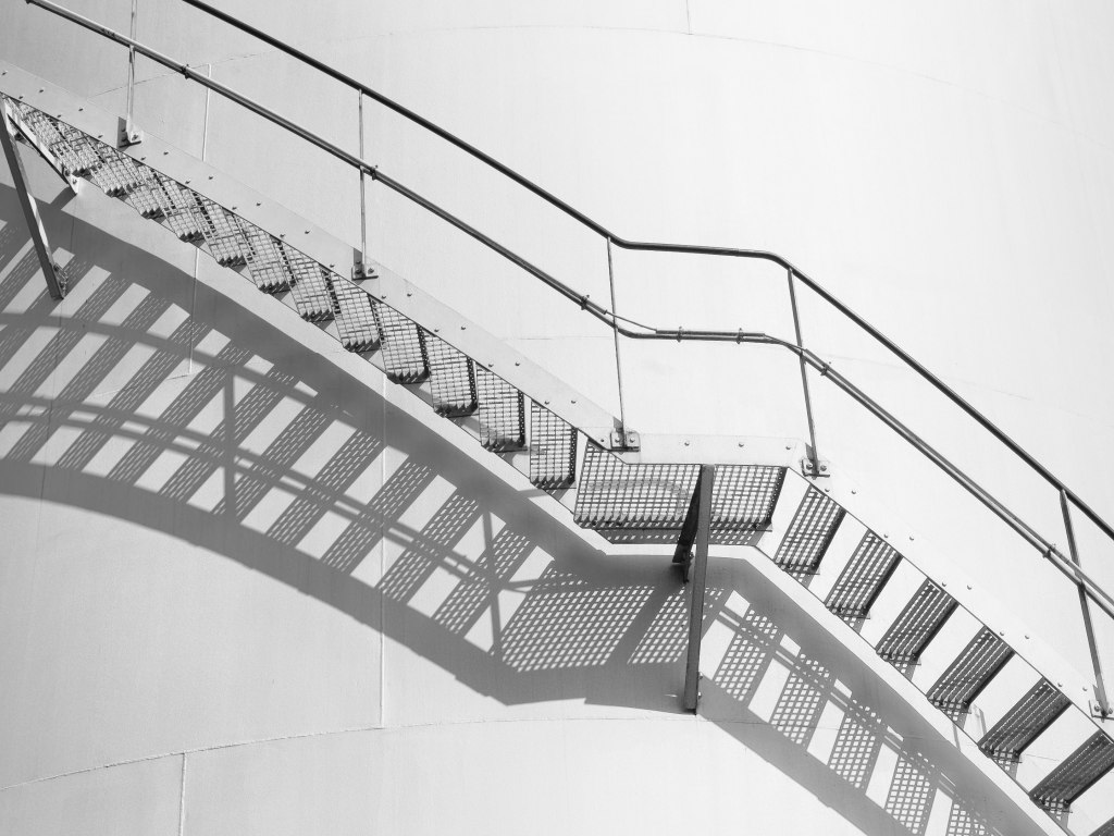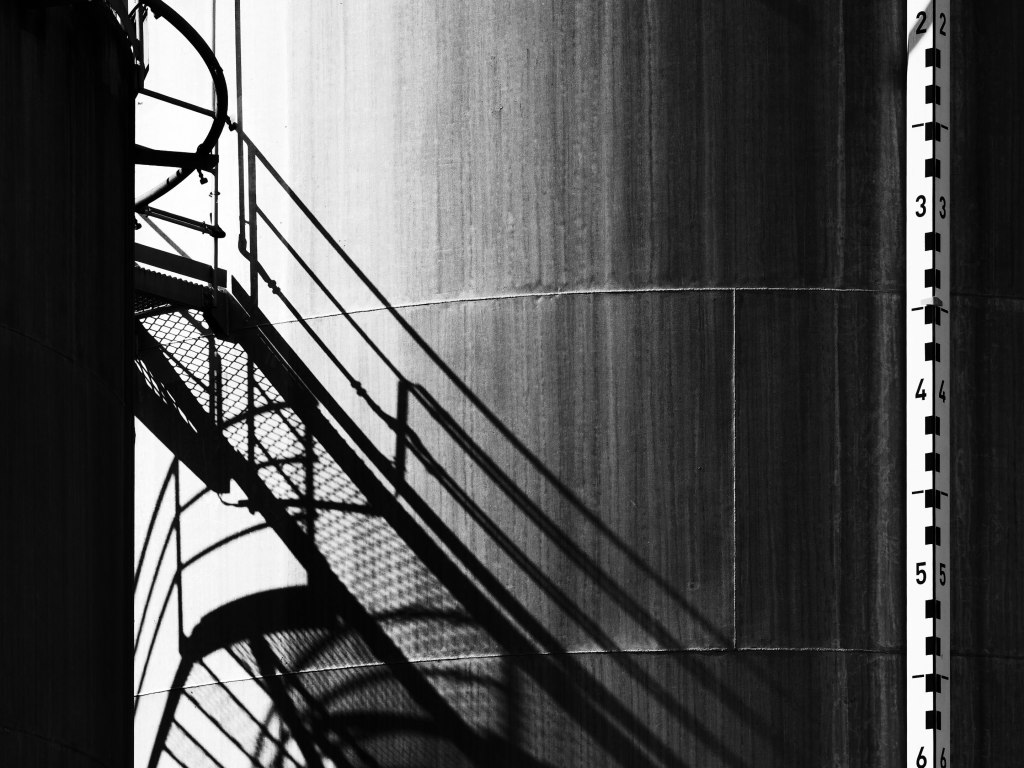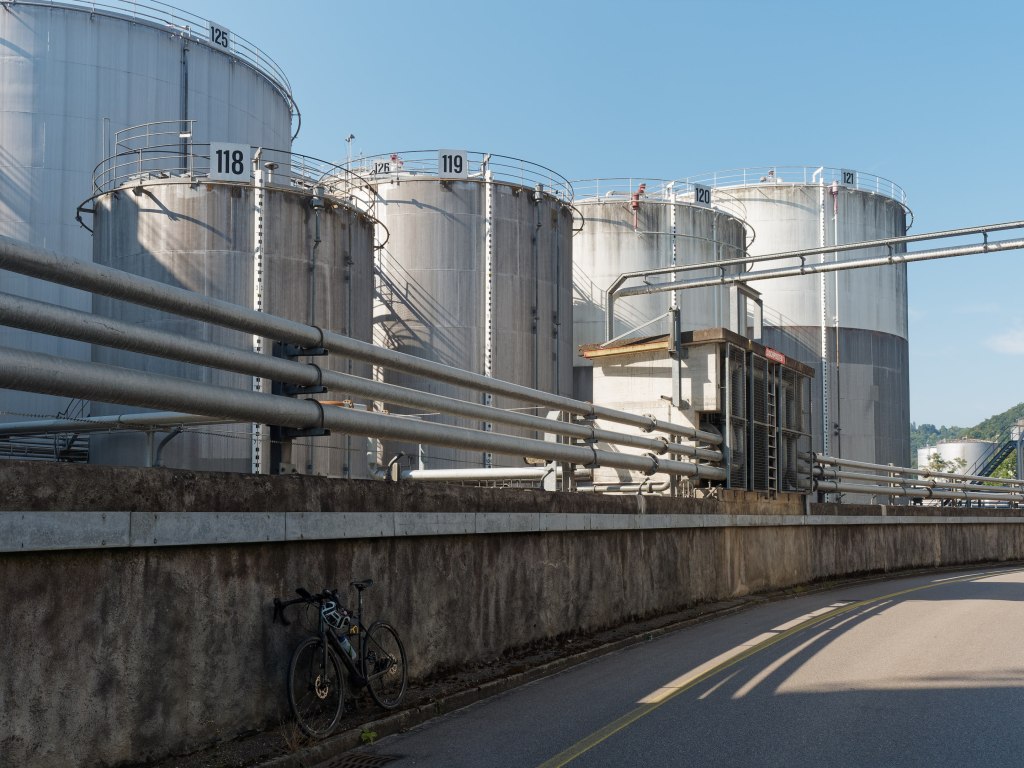 So viele Kilometer waren es bisher nicht, also mache ich noch einen Abstecher in das Industriegebiet Auhafen, das bereits zu Muttenz gehört. Hier reihen sich schier endlos Tanks für verschiedenste Brennstoffe aneinander.  Langweilig? Mir gefällt’s: Im hellen Schein der Sonne sind besonders die Schattenspiele durch die Außentreppen ein schönes Motiv.