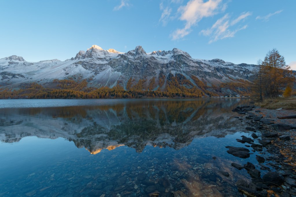 November – der Herbst geht so langsam in den Winter über. Nun ja, vielleicht nicht unbedingt im südbadischen Flachland, aber im Oberengadin auf 1800 Metern über dem Meer war es letzte Woche bereits so weit. Die warmen Herbstfarben waren noch präsent durch die gelb leuchtenden Lärchen, aber über Nacht fiel bereits eine hauchzarte Schicht Schnee, die zumindest auf dem felsigen Untergrund liegenblieb. Dieser Übergang von warmen zu kalten Farben macht das Besondere des Fotos aus, übrigens ganz ähnlich wie beim letzten Monatsfoto von Sebastian.