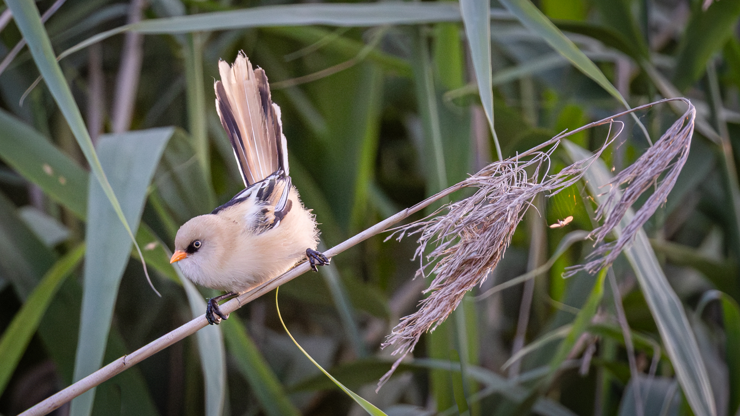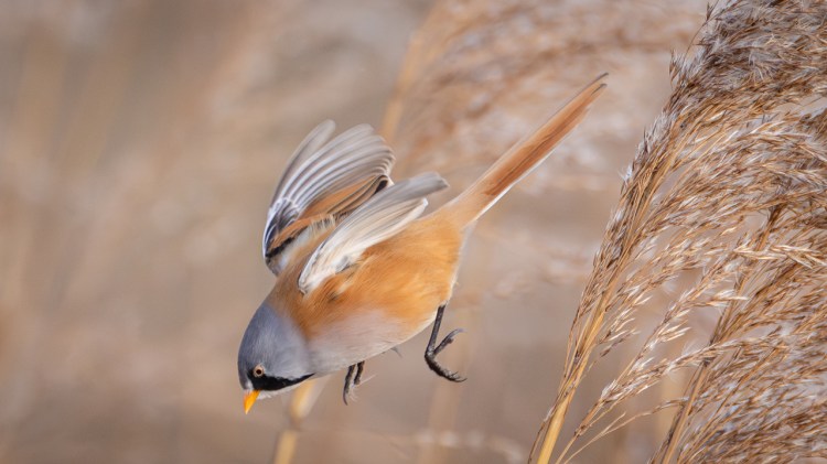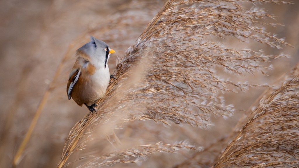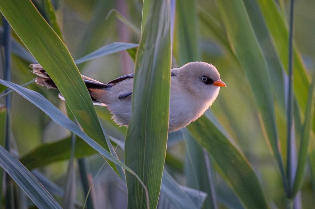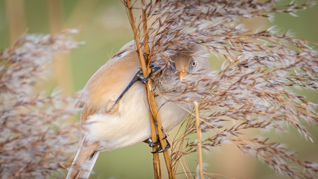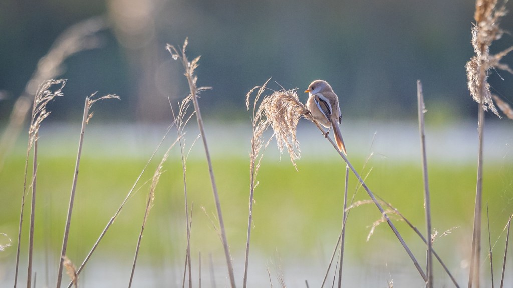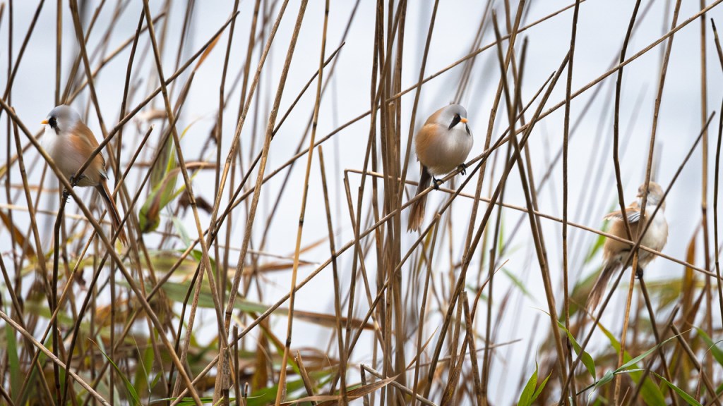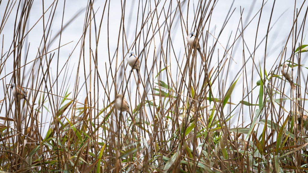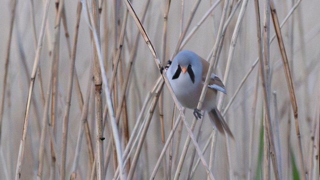Meine letzte Begegnung mit Bartmeisen liegt gerade mal acht Tage zurück – an einem windigen (schlecht), sonnigen (gut) Nachmittag in einem Schutzgebiet im Südosten Englands. Bei Wind schaukeln die Schilfhalme so stark, dass die Vögel sich tendenziell etwas tiefer im Röhricht aufhalten. Aber die Nahrung ist überwiegend oben zu finden, weshalb sie ab und dann doch mal am Halm hochklettern und sich einen Snack holen. Dann heißt es: fix sein und (falls man fotografieren möchte) auf den Autofokus der Kamera vertrauen… Hier hat es mal geklappt.