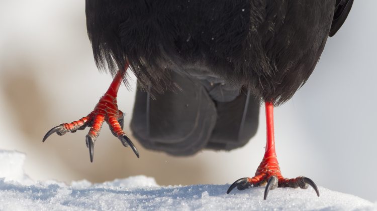 Am Gemmipass im Januar 2025 war das fotografische Ziel ja eigentlich der Bartgeier. Der zeigte sich an den zwei Tagen allerdings nur sehr entfernt und hätte bestenfalls zum Thema „Ganz weit weg“ gepasst ☹. Zum Zeitvertreib konnten wir uns aber bestens mit den Alpendohlen beschäftigen. Diese sind nicht ganz so attraktiv, aber die roten Füße im Schnee machen doch was her!