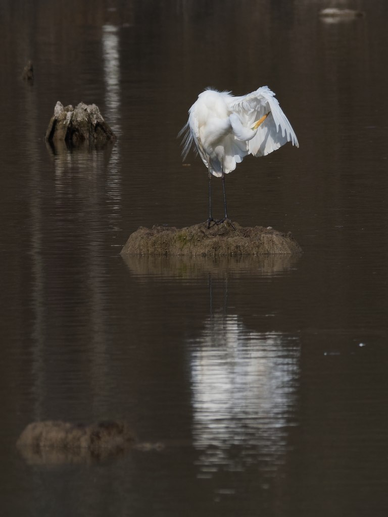 Nach einigen Minuten Fußmarsch waren zu unserer Überraschung gleich eine ganze Handvoll Silberreiher zu sehen. Diese Reiherart ist ja hierzulande meist nur auf der Durchreise und gelegentlicher Wintergast – wobei ich mich hier gerne von Vogelexperten belehren lasse. Einen Reiher konnten wir besonders gut bei der ausgiebigen Gefiederpflege beobachten. Hinter der Uferböschung waren wir wohl ausreichend versteckt, so dass er sich gar nicht aus der Ruhe bringen ließ.