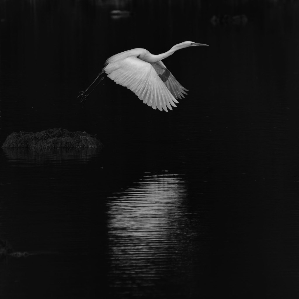 Nach einigen Minuten schien sich der Reiher bereit für den Weiterflug zu machen – und tatsächlich, ein kurzes Anruckeln und ab ging’s! Mein großes Glück: die Kamera war im Anschlag, die Belichtungszeit kurz, der Reiher flog exakt im rechten Winkel zur Kameraposition ab. So gelangen ein paar schöne Aufnahmen, die in Schwarz-Weiß besonders gut aussehen!
