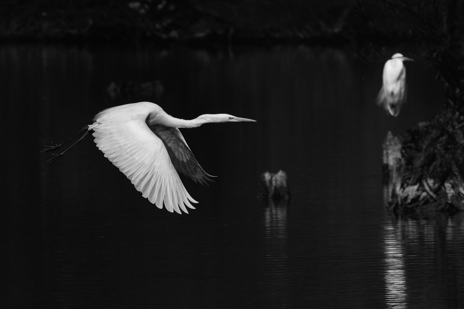 Nach einigen Minuten schien sich der Reiher bereit für den Weiterflug zu machen – und tatsächlich, ein kurzes Anruckeln und ab ging’s! Mein großes Glück: die Kamera war im Anschlag, die Belichtungszeit kurz, der Reiher flog exakt im rechten Winkel zur Kameraposition ab. So gelangen ein paar schöne Aufnahmen, die in Schwarz-Weiß besonders gut aussehen!