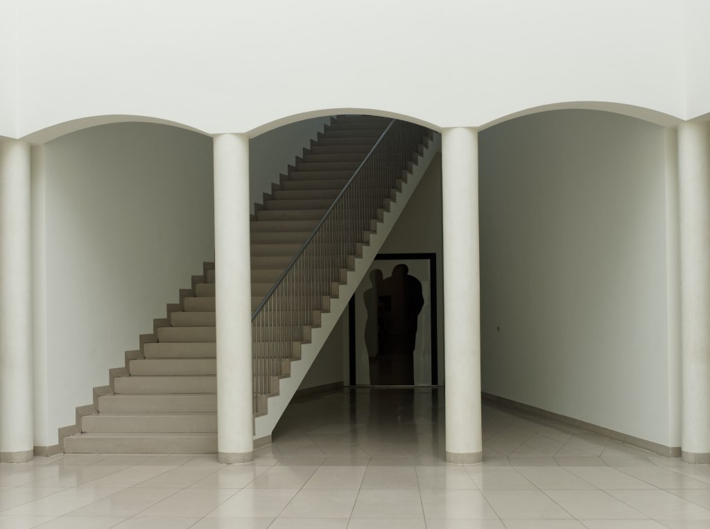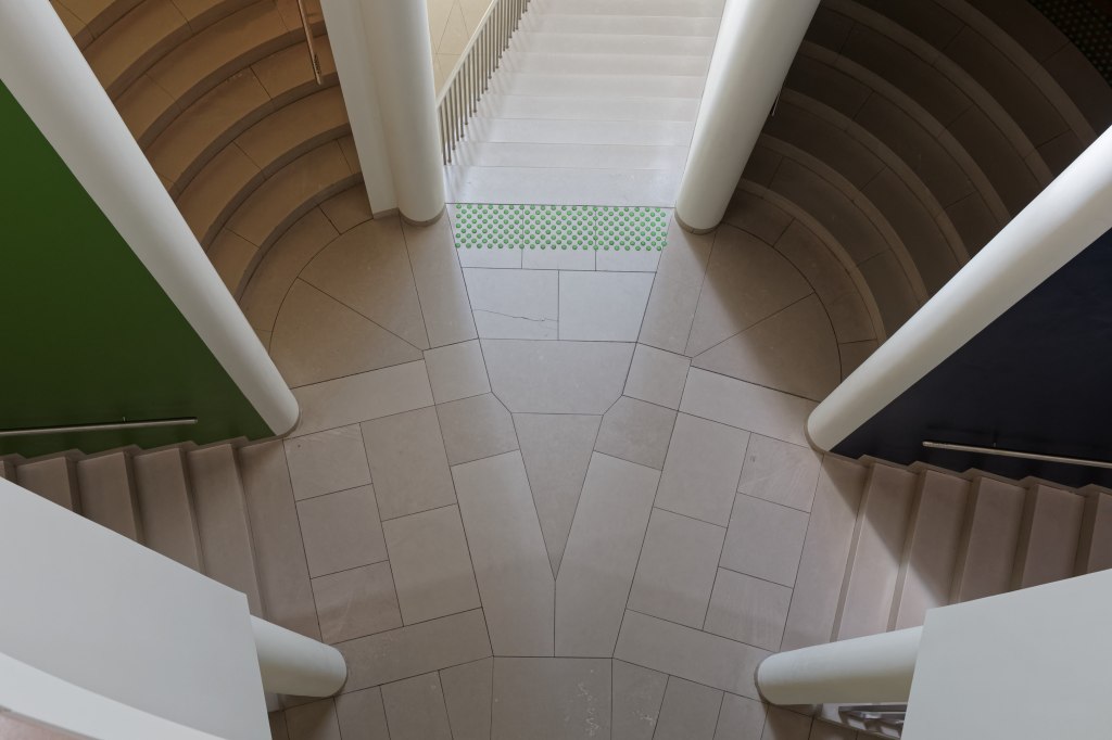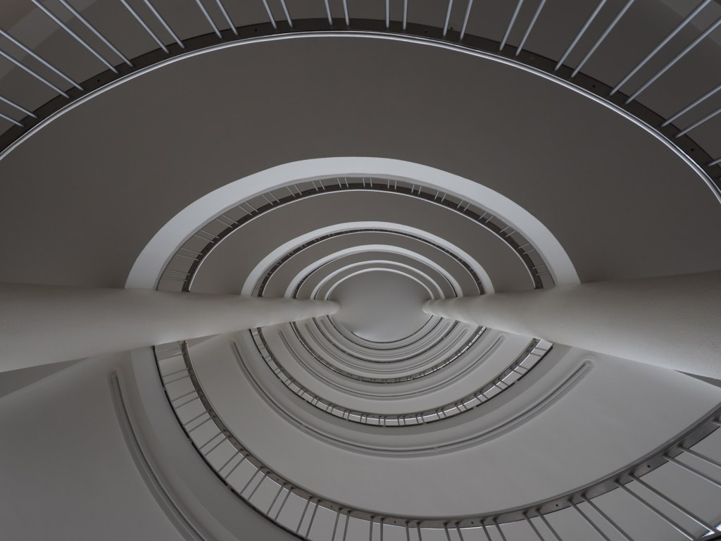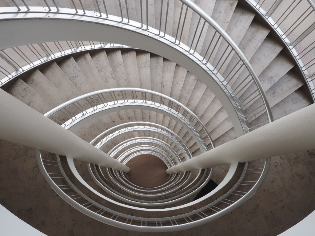 Wenn wir schon bei schicken Perspektiven sind, schauen wir noch im sogenannten Juniorhaus vorbei, einem der ersten Hochhäuser Frankfurts (Baujahr 1951), heute ein Bürogebäude von vielen. Wobei der Begriff „Hochhaus“ heute irreführend ist: es ist nur 35 Meter hoch, kann aber dafür mit einem ovalen Treppenhaus beeindrucken.