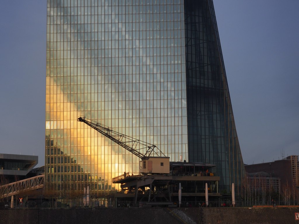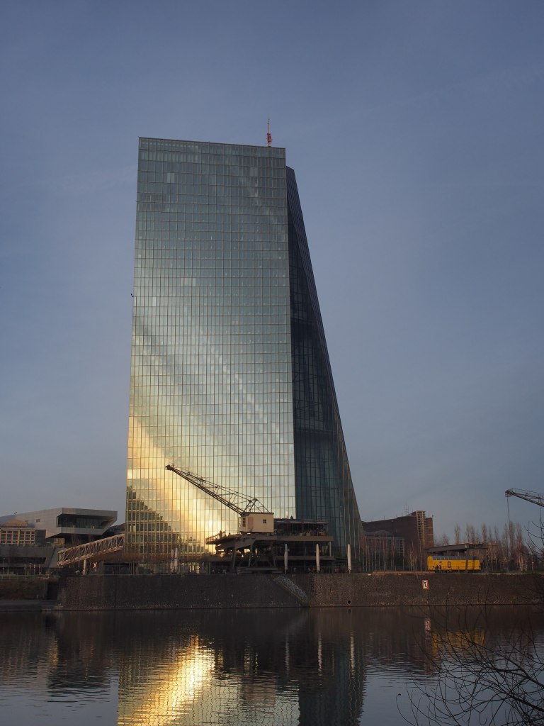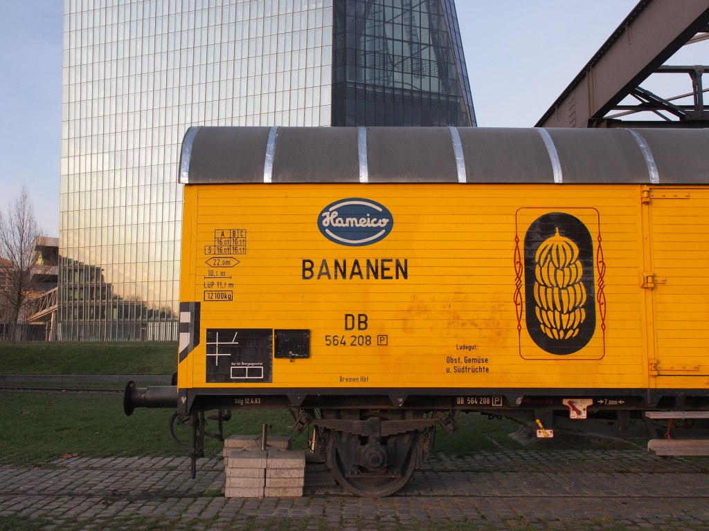 Es dämmert bereits, als ich an der EZB ankomme. Dort wurde meines Wissens nie mit Bananen gehandelt, auch wenn der Waggon anderes vermuten lässt :-).