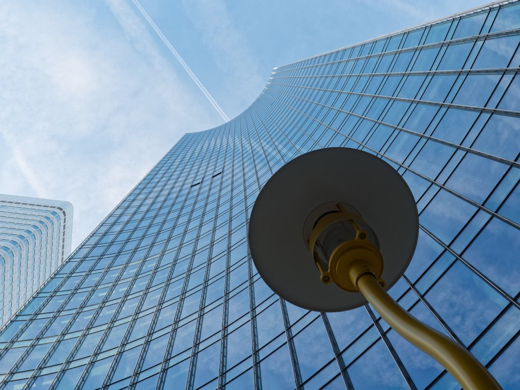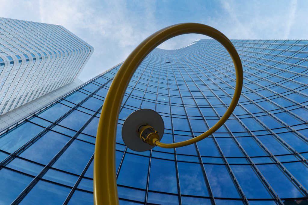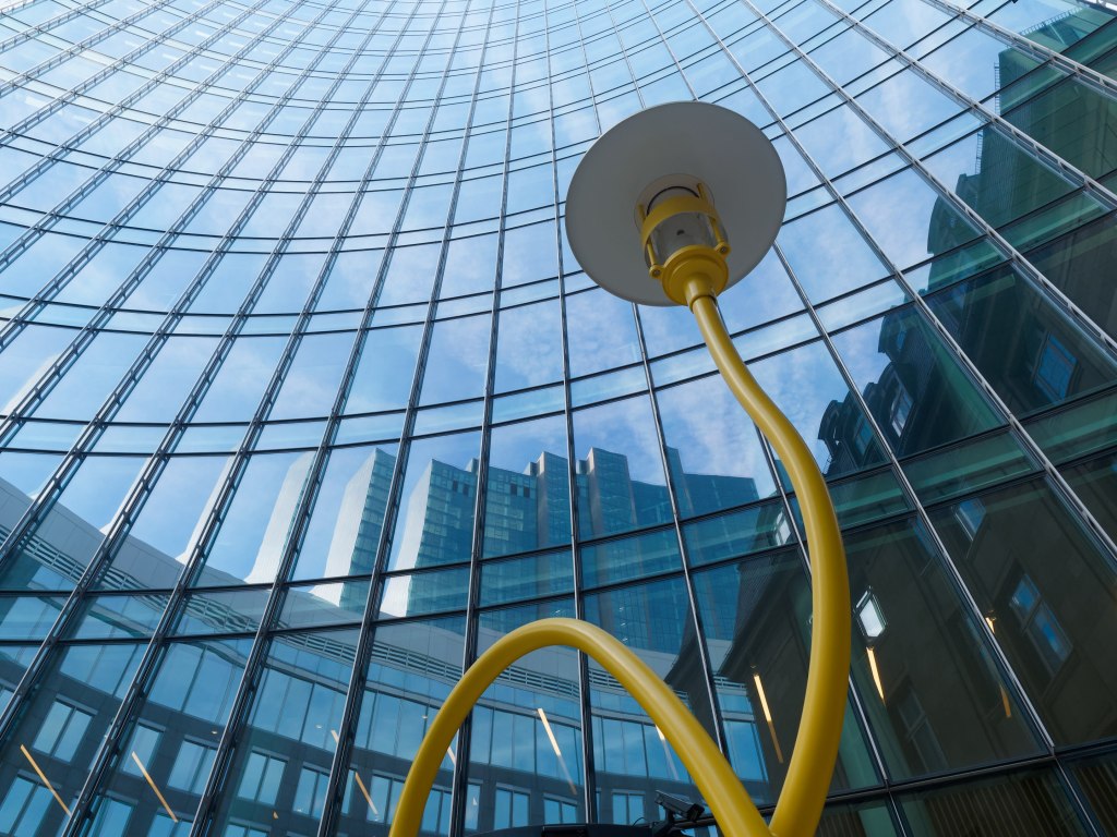 Weiter geht es nun durch die Straßen des Financial Districts. An manchen fotogenen Ecken läuft man fast vorbei. Die gebogenen gelben Lampen am Skyper Hochhaus hätte ich fast verpasst. Sie sind auch noch relativ neu, der Künstler Jeppe Hein hat sie erst 2024 installiert. Aus der Froschperspektive bieten sich schöne Kontraste zu den umliegenden Gebäuden.