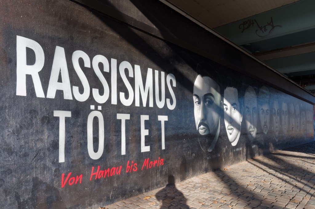 Nun mache ich mich auf zu einem längeren Spaziergang Richtung Europäischer Zentralbank (EZB) immer am Mainufer entlang. Nach nur wenigen Schritten unterquere ich die Friedensbrücke. Passend zum Namen wird hier durch ein Wandbild an die schrecklichen Vorgänge in Hanau im Jahr 2020 erinnert.