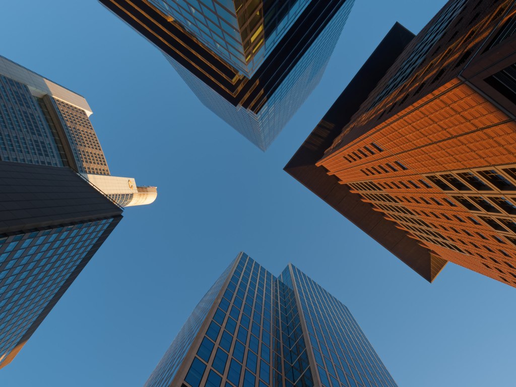 Der Blick nach oben lohnt sich auch wieder zwischen Japan Center und Commerzbank-Tower nur einen Block weiter.