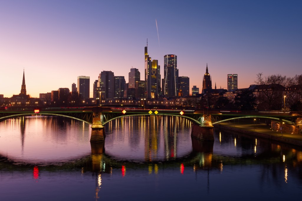 Mittlerweile ist die Sonne untergangen. Die blaue Stunde ist natürlich die perfekte Zeit, um den Rundgang abzuschließen und den Blick auf die Skyline zu genießen. Die Bilder sind von der Flößerbrücke und der Ignatz-Bubis-Brücke aus entstanden. Ein Experiment mit Zoom-Effekt ist auch dabei.
