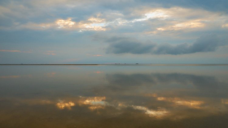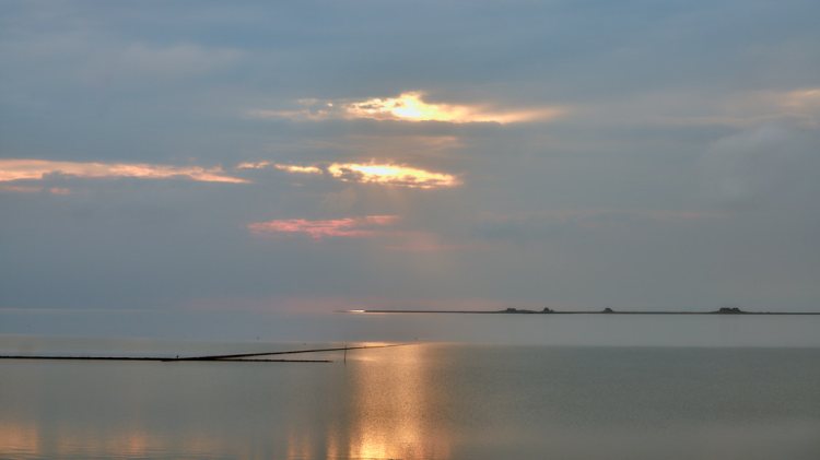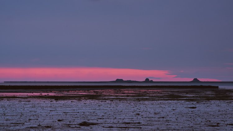 Und vor Ort angekommen, kämpften sich bereits die ersten Strahlen durch die Wolken. Sie lieferten uns ein wunderbares weiches Licht. Glattes ebbendes Wasser wirkte wie ein Spiegel und bescherte uns stimmungsvolle Aufnahmen vor der Hallig Nordstrandischmoor.