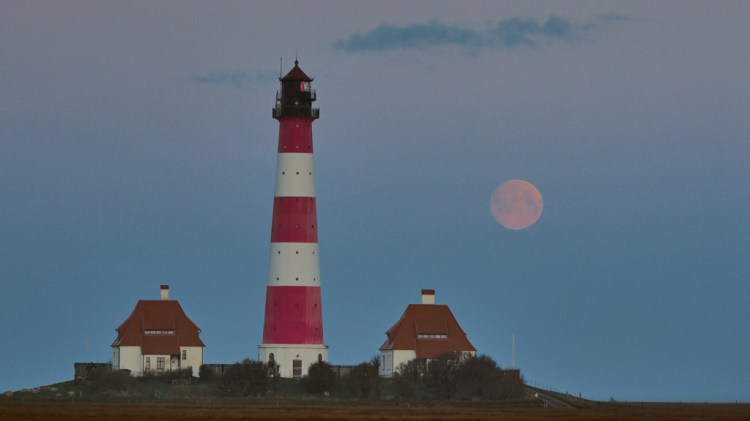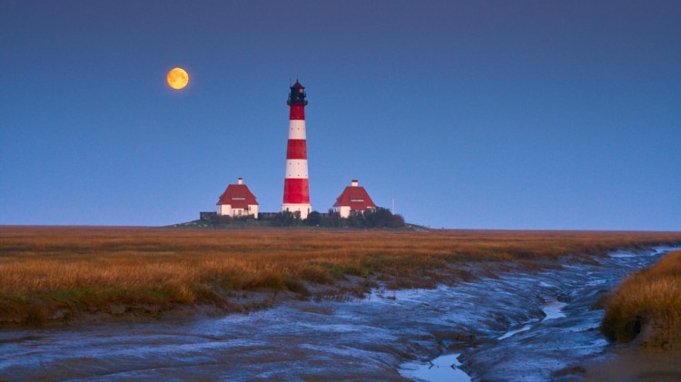 Wir sind bei unserem Vorhaben geblieben, untergehenden Mond und Leuchtturm zusammen abbilden zu wollen. Dafür hatten wir schon im Vorweg geprüft, an welchem Standort wir das in etwa erreichen. Hierfür mussten wir noch ein paar hundert Meter durchs Vorland gehen und erreichten dann zügig die geplante Stelle. Das Wetter veränderte sich leider nicht.