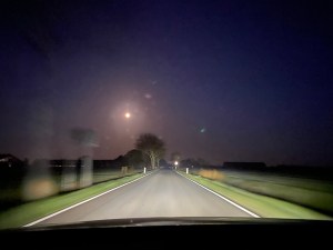 Wenn der Mond sich weiter Richtung Horizont bewegt, hat man immer das Gefühl, dass er das mit zunehmender Geschwindigkeit tut. Relativ schnell war dann klar, dass der Standort doch nicht ganz optimal war. Der Mond könnte sich direkt hinter den Leutturmwärterhäusern in den Horizont verabschieden. Die AR-Funktion (= Augmented Reality) unserer App bestätigte das. Da der Mond ja nicht auf uns warten wollte, war kurzerhand noch ein Umzug in Eile angesagt.