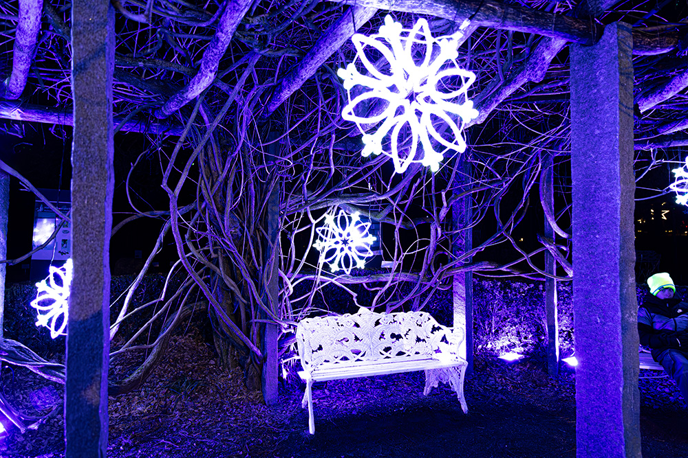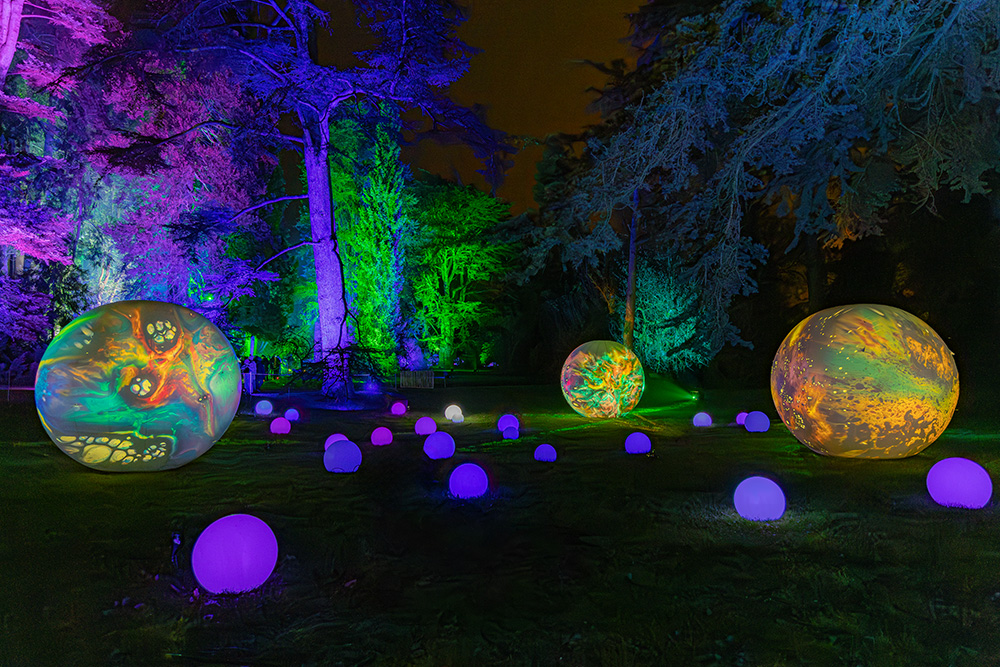 Der Rundweg bis zum Schloss bietet allerlei Sehenswürdigkeiten. Man sieht Altbekanntes, das im Frühjahr und Sommer bepflanzt ist und jetzt in einem bunten Lichterglanz erstrahlt, und Neues, das fast schon mystisch zwischen den Bäumen und Sträuchern glitzert. Tänzerinnen, elfengleich, sind am Wegesrand zu finden, genauso wie bunte Kugeln, die fast wie ein fremdes Universum erscheinen.